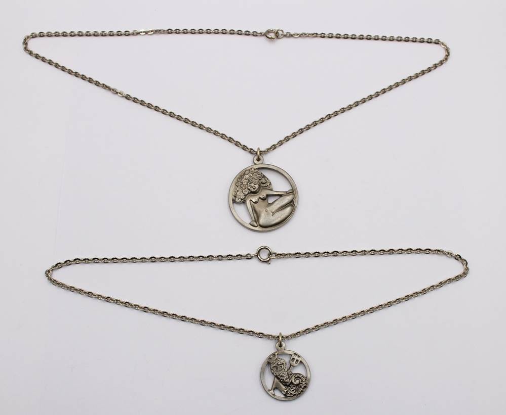 2x Zinn-Anhänger an versilberten Ketten, Jorgen Jensen, Sternzeichen, ca. D-3 und 2,5cm