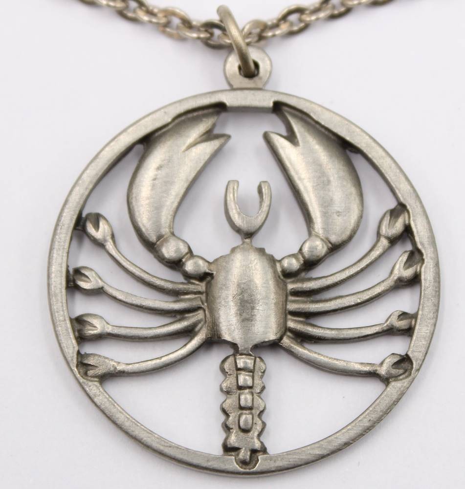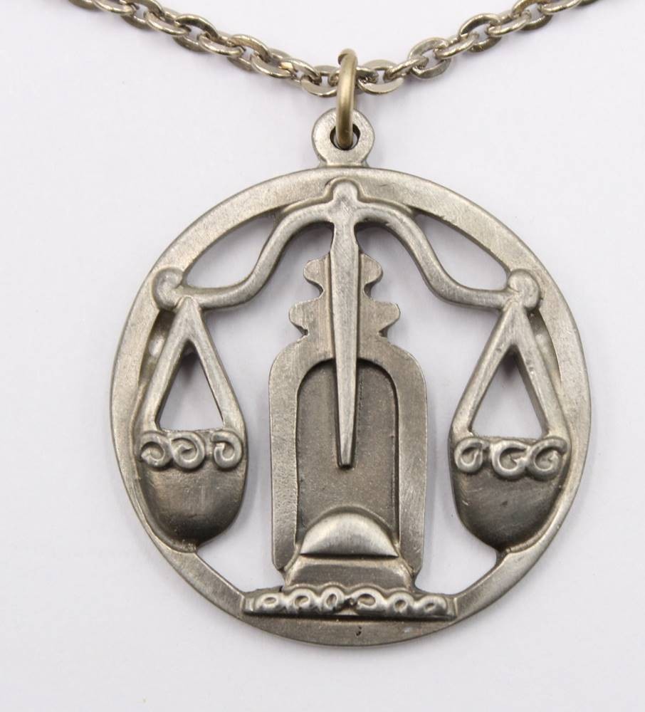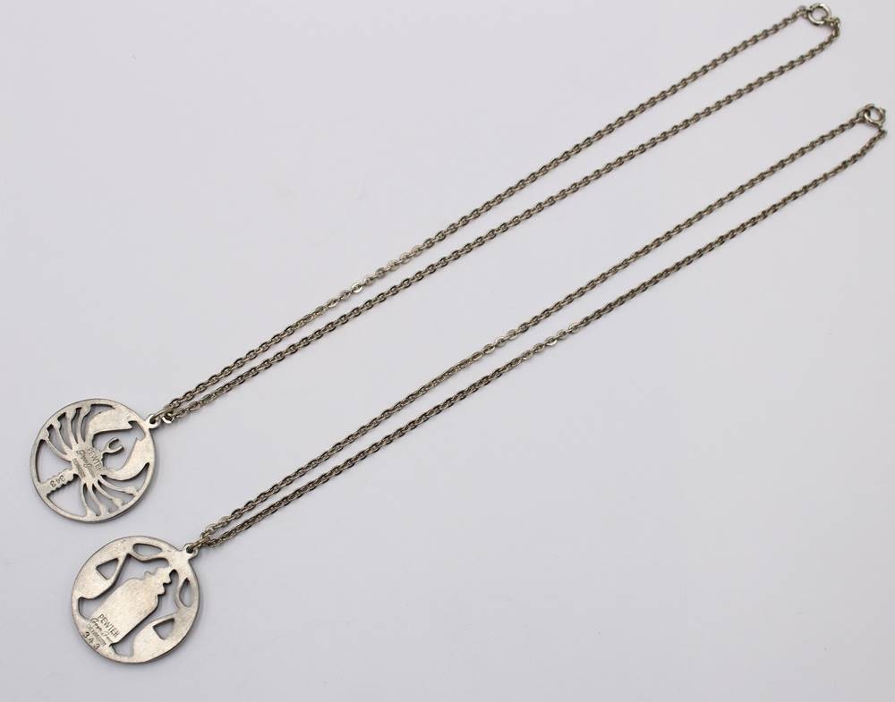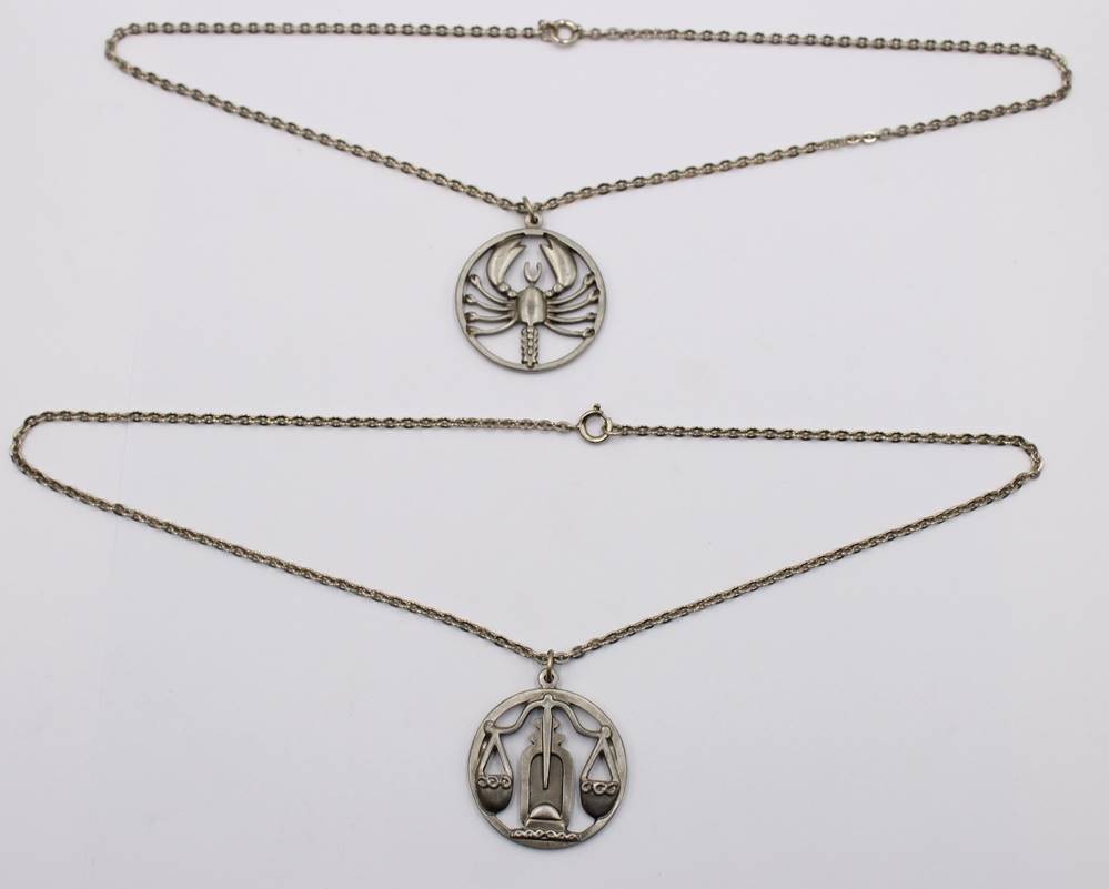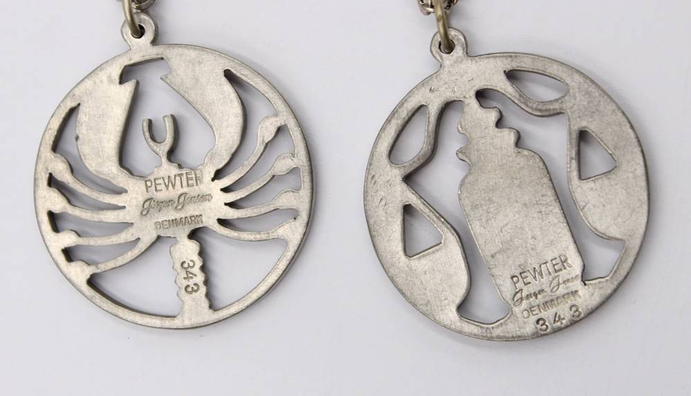 2x Zinn-Anhänger an versilberten Ketten, Jorgen Jensen, Sternzeichen, ca. D-3cm