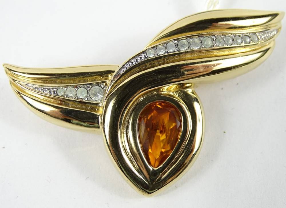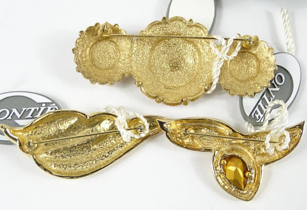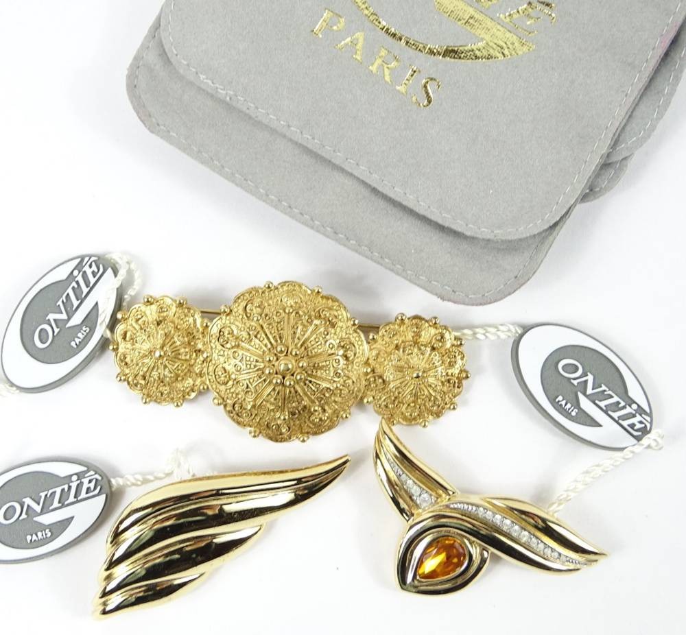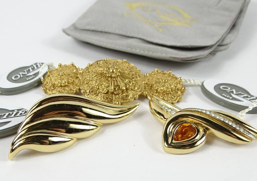 3 vergoldete Broschen, Gontié Paris, neuwertig, in orig. Stofftaschen, L. 5,5-8 cm [1]