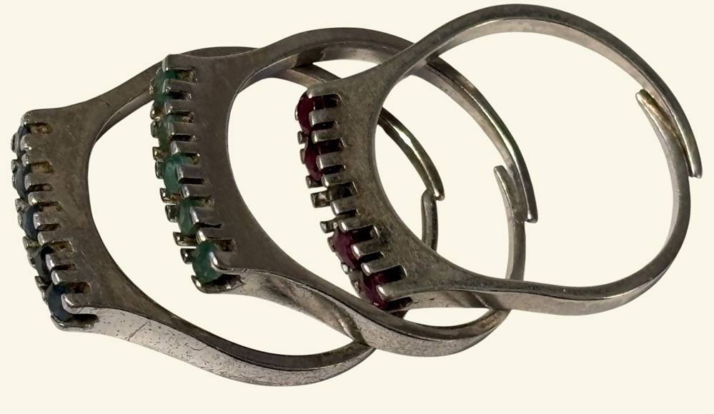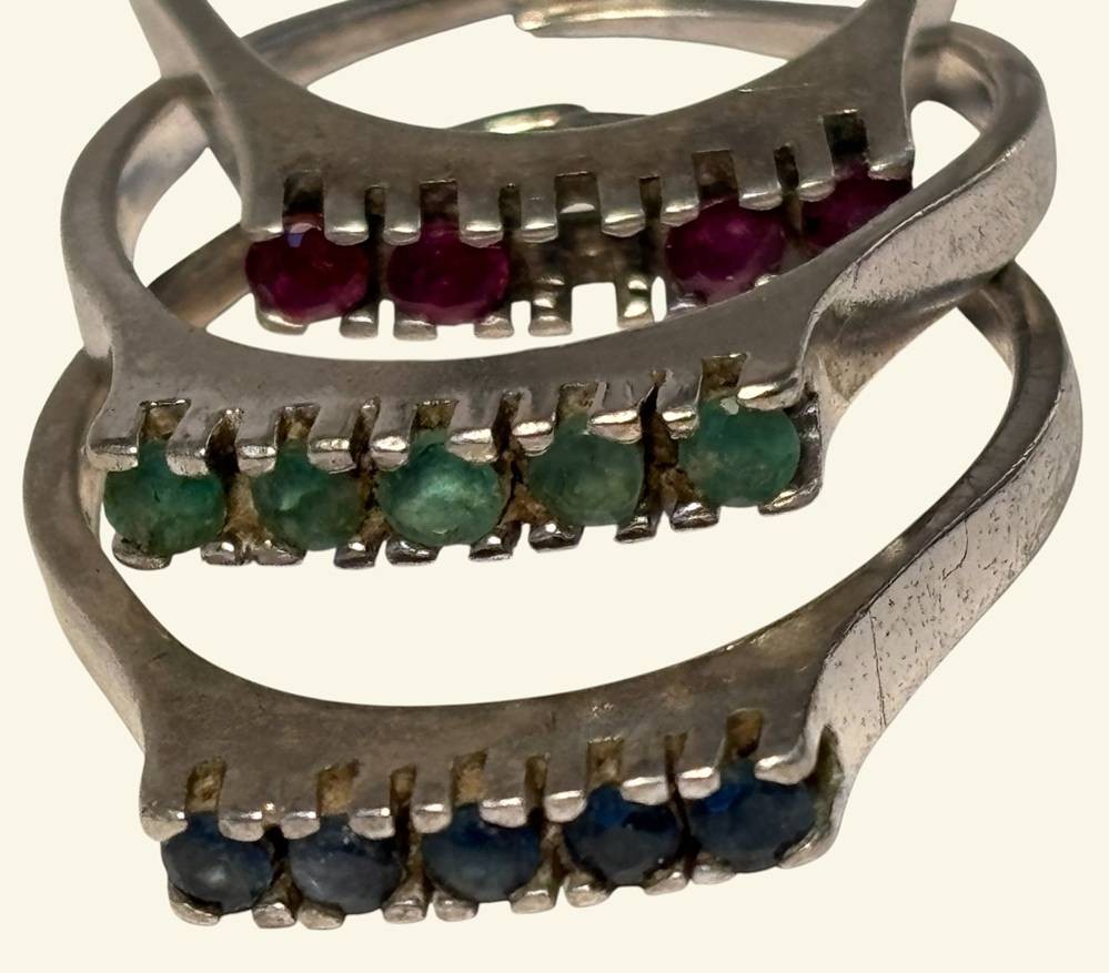 3 Vorsteckringe, Silber-835-, Rubine, Safire, Smaragde (ein Rubin fehlt), offene Ringschienen, zusammen 7,6 gr [1]