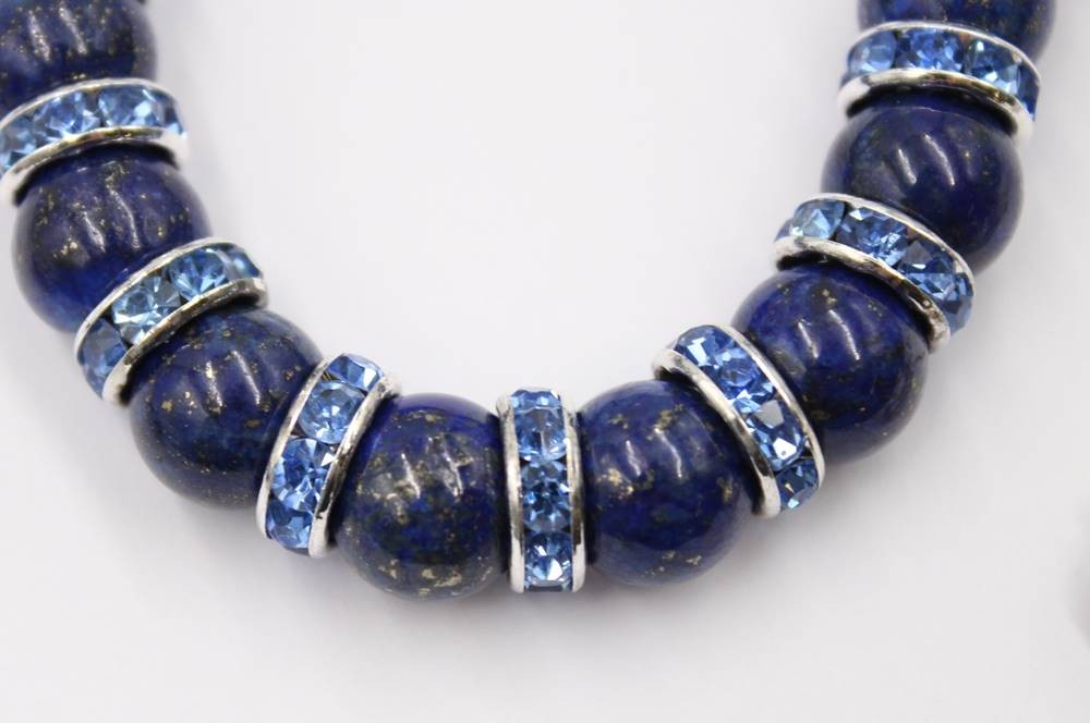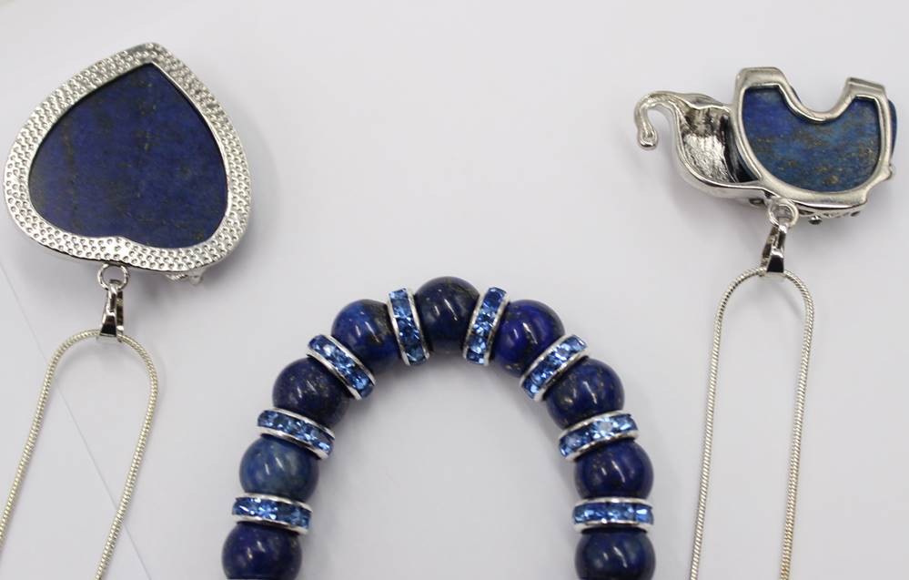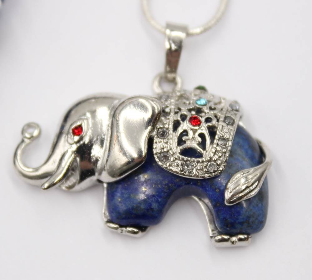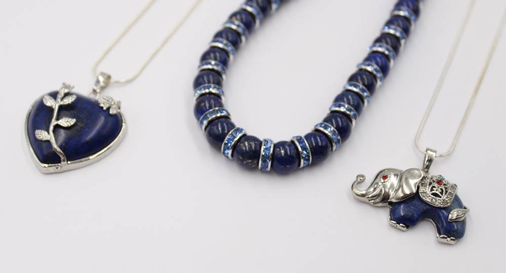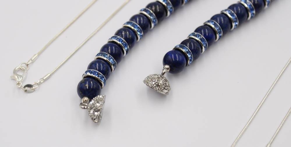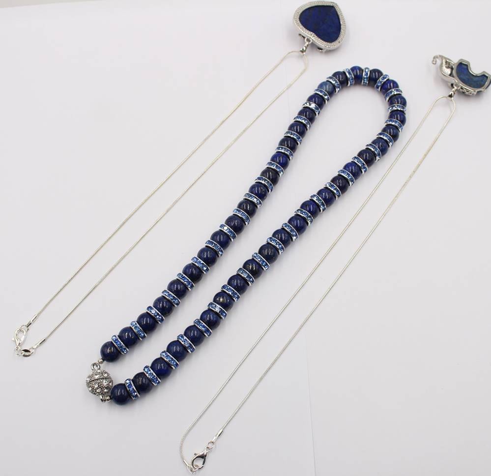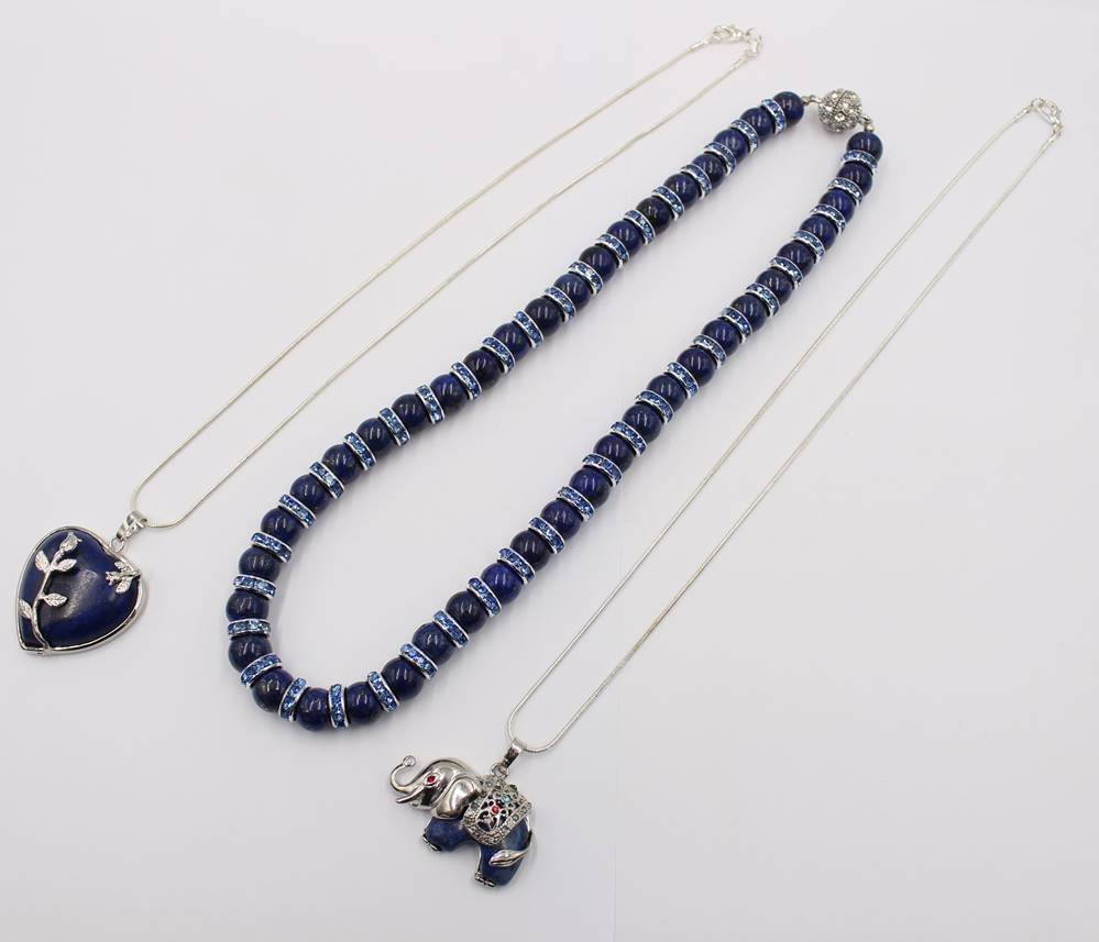 3x div. Halskette, 2x mit figürlichen Lapisanhängern, 2x versilbert, ca. L-50cm [1]