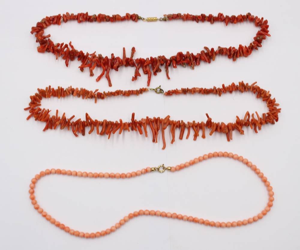 3x div. Korallen-Halsketten, 2x Stabkoralle, ca. L-50cm