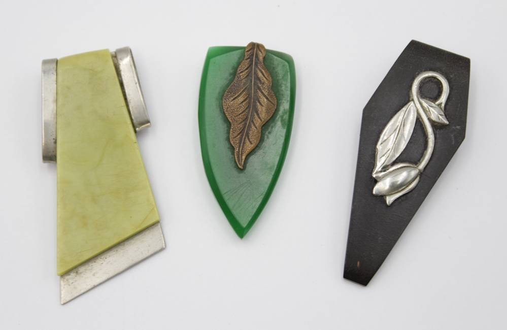3x div. Schal-Clips, Art-Deko, Bakelit/Metall, 1x wohl Jakob Bengel, ca. L-6cm [1]