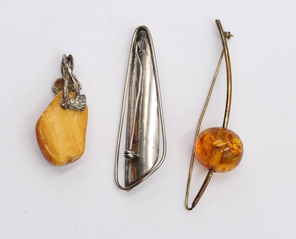 3x div. Silber-Broschen mit Bernsteinen, 1x Fischland, zus. ca. 23,3gr., L-ca. 7,5cm [1]
