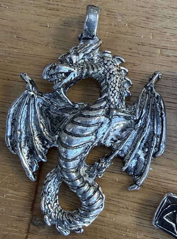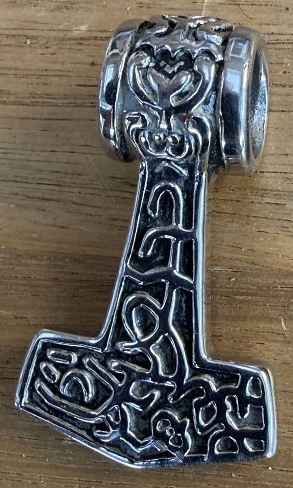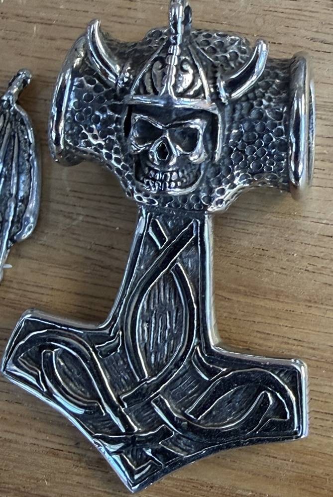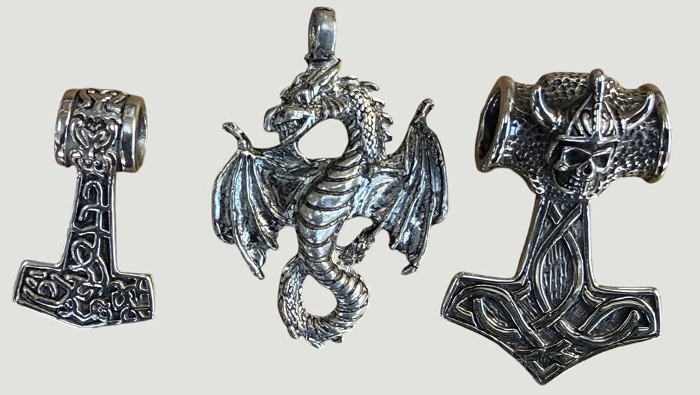 3x gr. Anhänger, Kelten/Wikinger-Schmuck, Drache, 2xThor Hammer, alles versilbert, H-max. 6 cm [1]