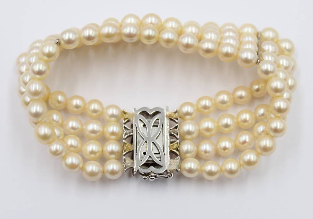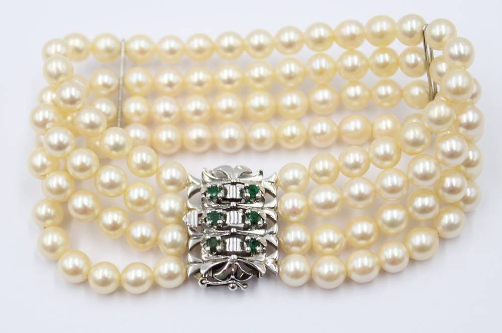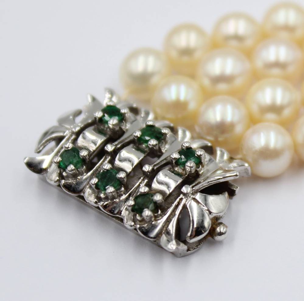 4reihiges Perlenarmband, 585 WG-Schließe mit Smaragdbesatz, ca. L-19cm [1]