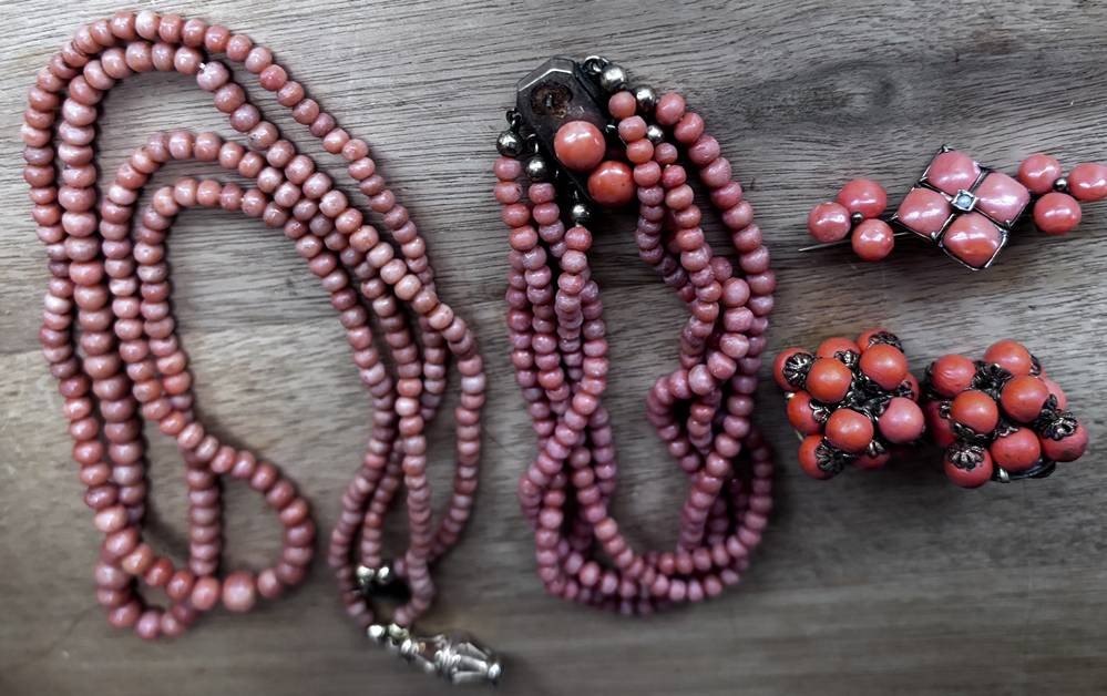 4x Koralle Schmuck, Kette, 2 reihiges Armband (1x fehlt auf Schliesse), Paar Ohrclips, Nadel, 54,2 gr. [1]