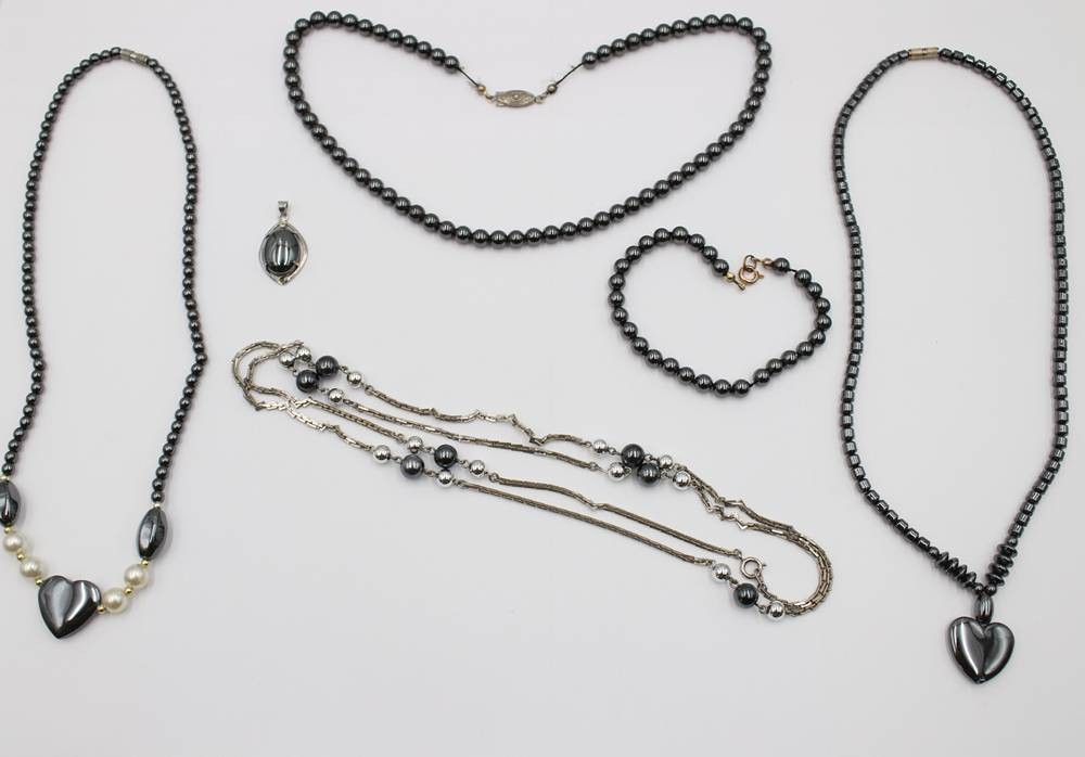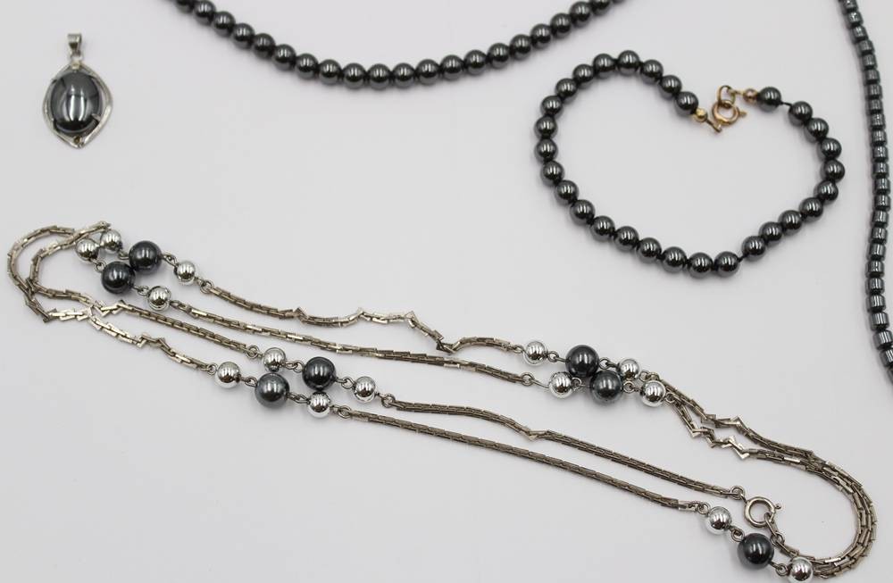 6 Teile div. Hämatit-Schmuck, Anhänger, Armband und 4 Ketten, ca. L-45cm