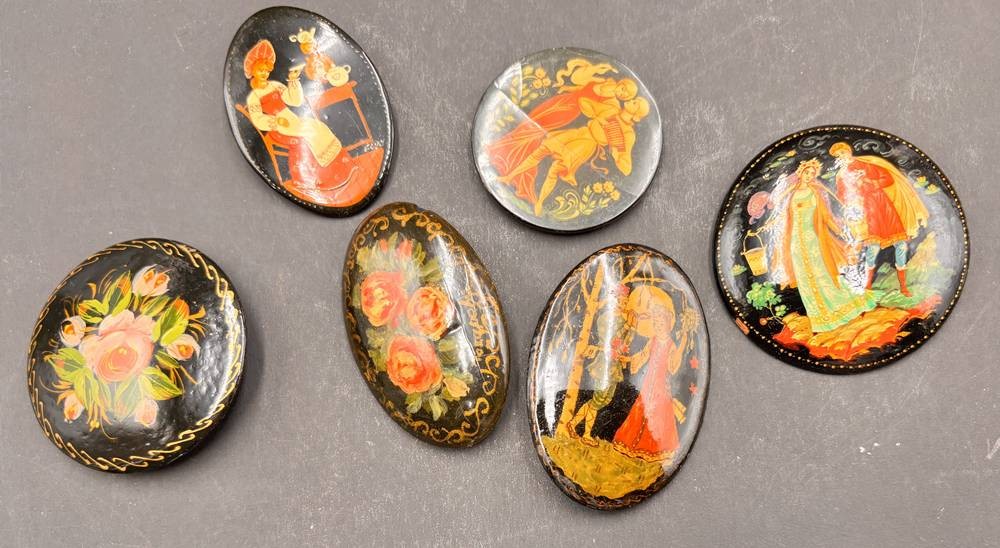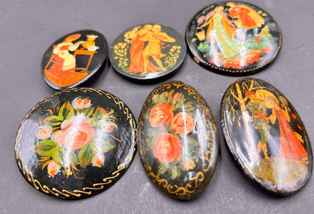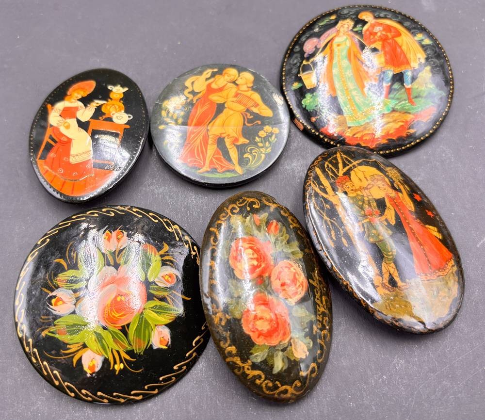 6x Lack-Broschen, russische Volkskunst, handbemalt, H-6 cm, D-5 cm max.
