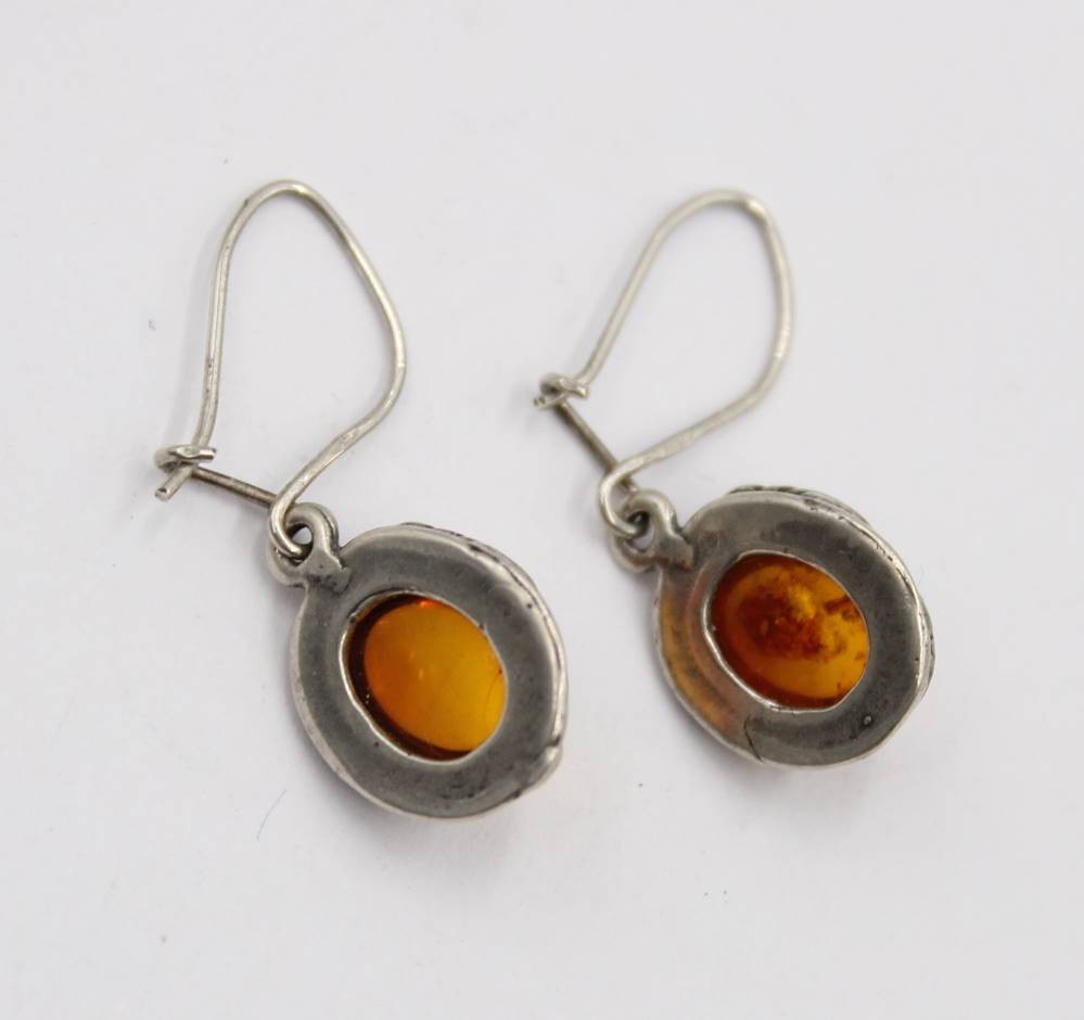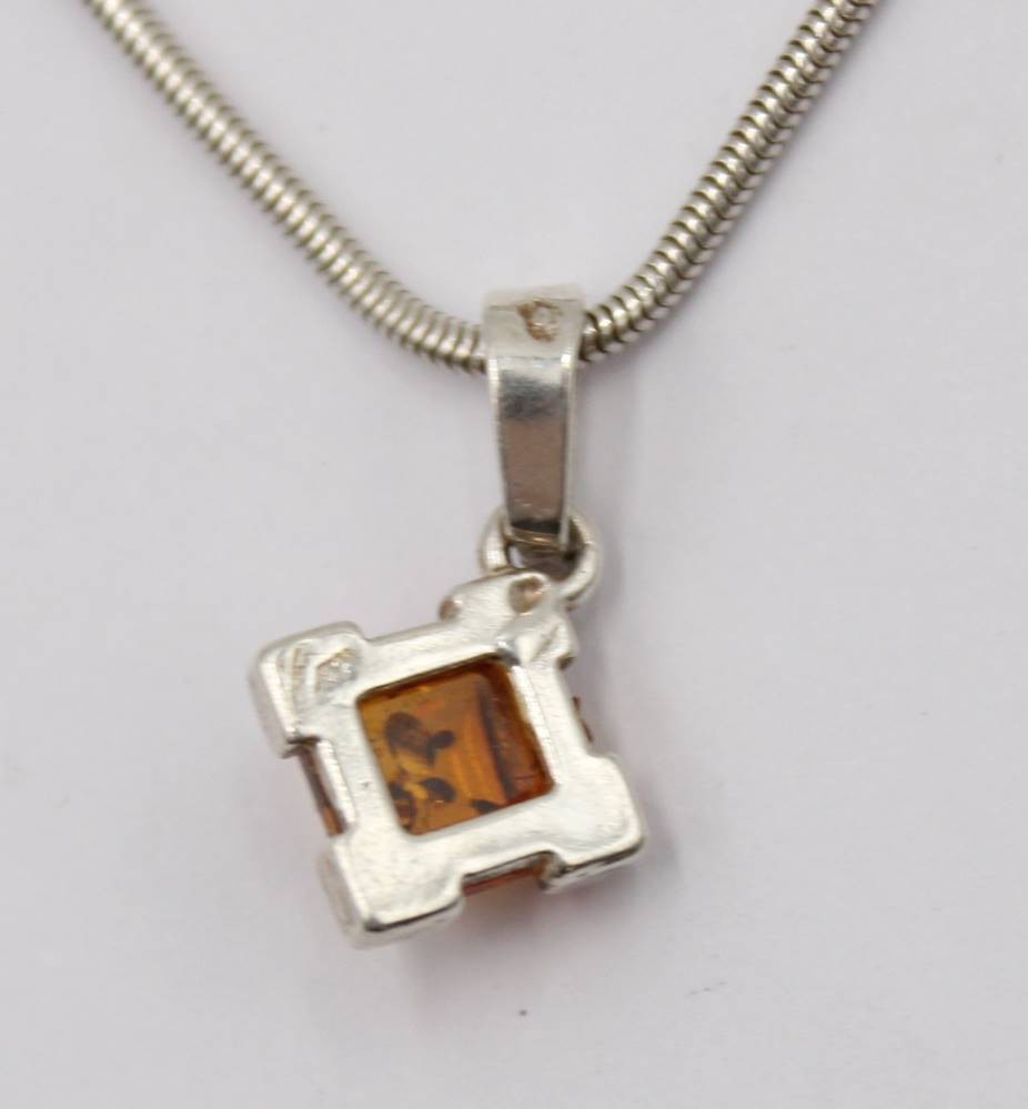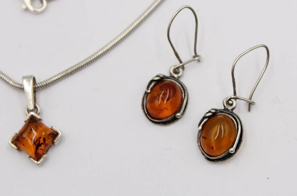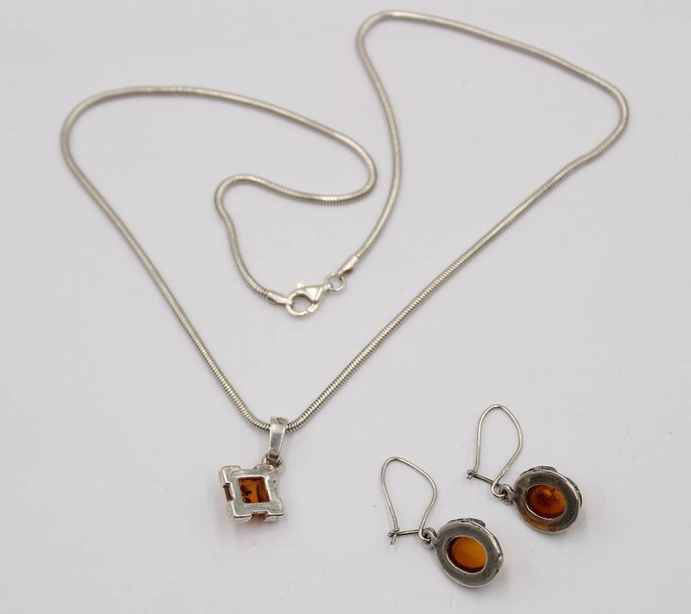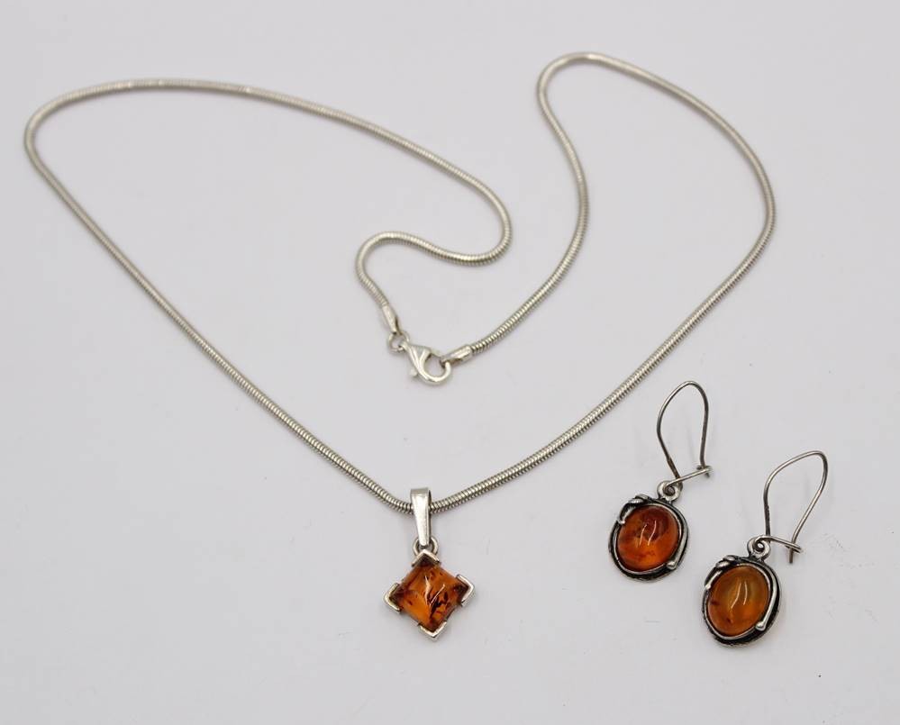 925er Schlangenhalskette mit Bernstein-Anhänger anbei Bernstein-Ohrhänger, zus. 9,9gr., Kette L-41cm, Anh. 2,2xm u. Ohrhänger L-3cm [1]