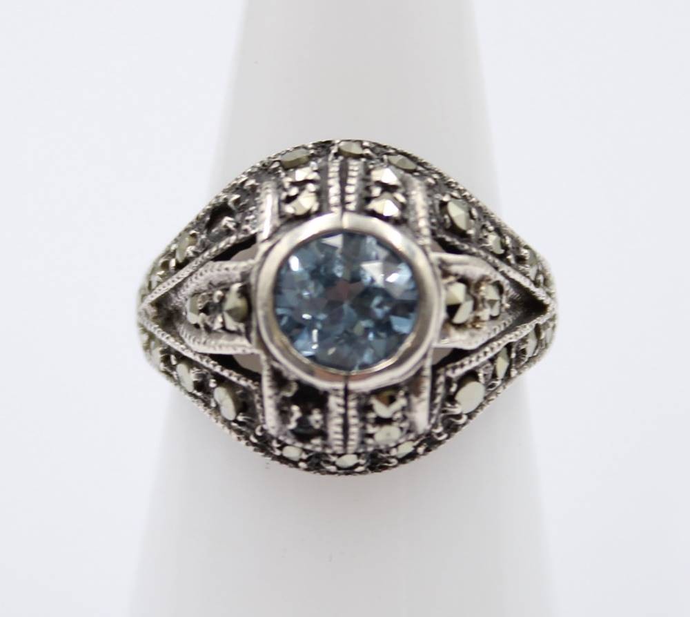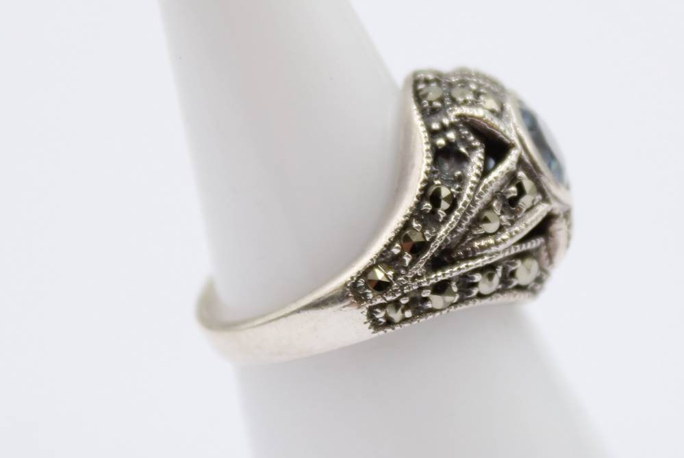 925er Silber-Ring, wohl Blautopas und Markasiten (3 fehlen), 5,1gr., RG 52 [1]