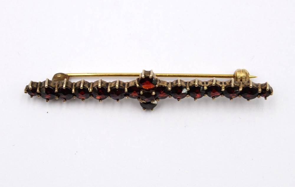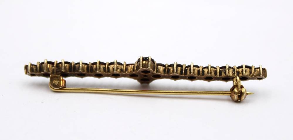 ältere Granat-Brosche, vergoldet, undeutl. gemarkt, L-6cm