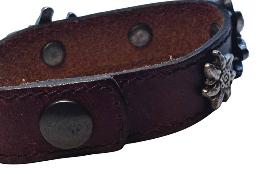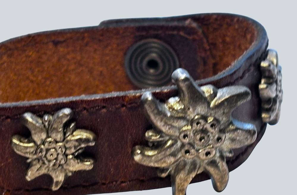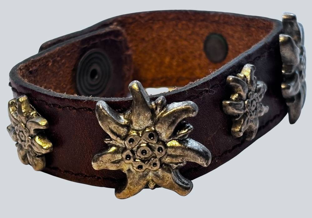 altes Leder-Armband mit Druckknopf, 5 Edelweiss-Blüten, versilbert, L-21 cm, B-2 cm [1]