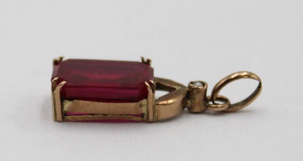 Anhänger, Gold um 14ct (gepr.), roter Farbstein, zus. ca. 1gr., L-1,5cm B-0,7cm. [1]