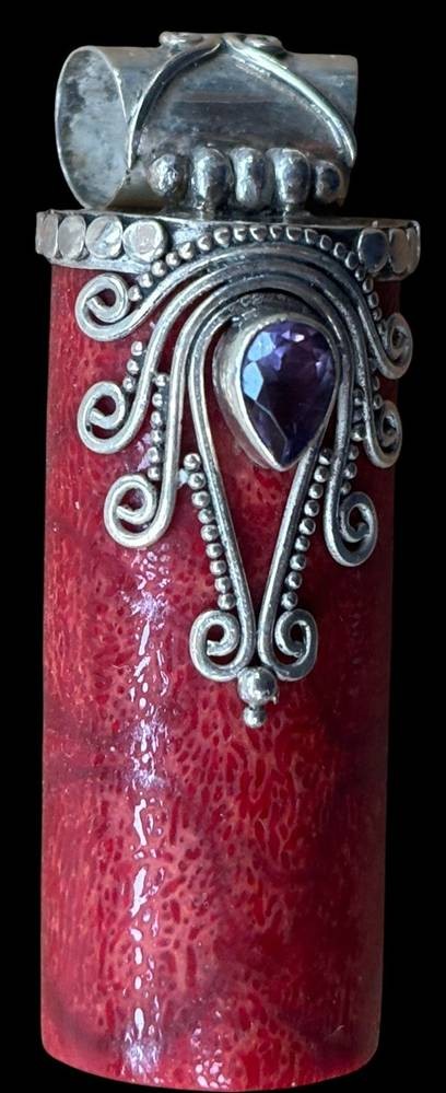 Anhänger mit Silbermontur, rot marmorierter Stein und lila facett. Stein, H-ca. 4,5 cm
