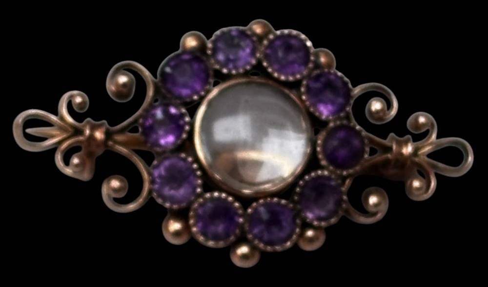 antike kl. Goldbrosche um 14 Karat (-585-), geprüft. klarer Mittelstein, umringt von Amethysten, L-3,1 cm, 4 gr. [1]