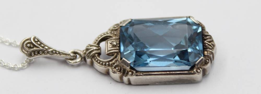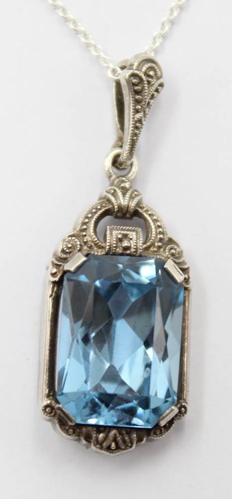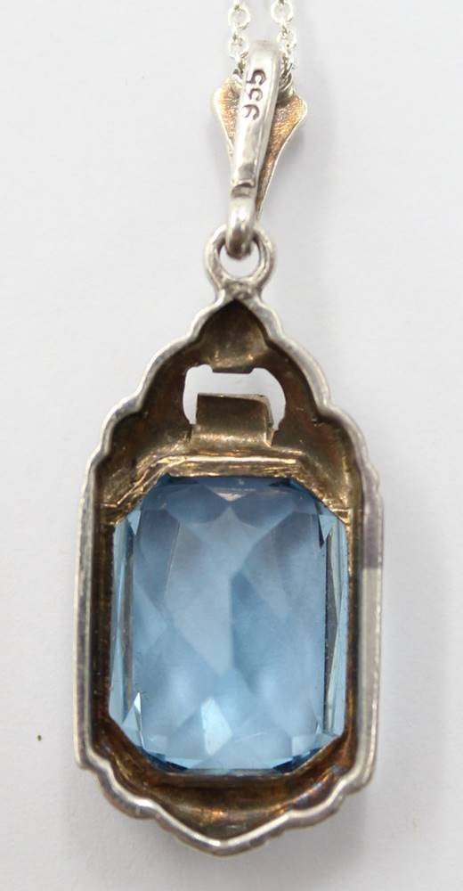 Losnummer 1049 - antiker 935er Silber-Anhänger mit blauem facett. Stein, an 925er Kette, zus. 4,9gr., L-38cm, Anh. 3,3cm