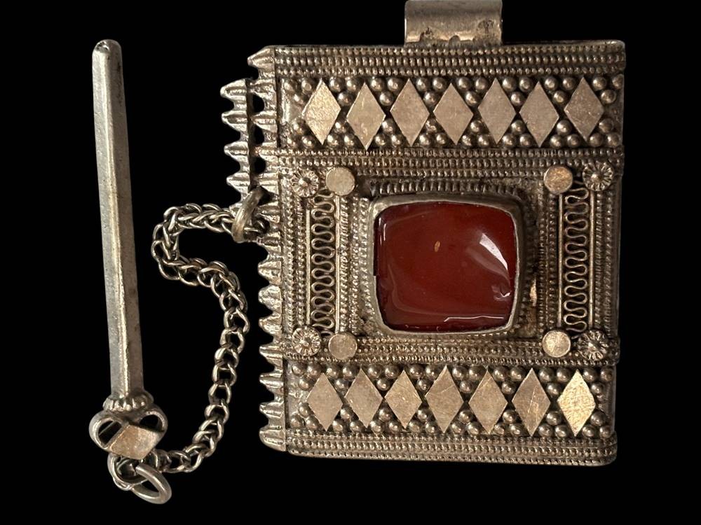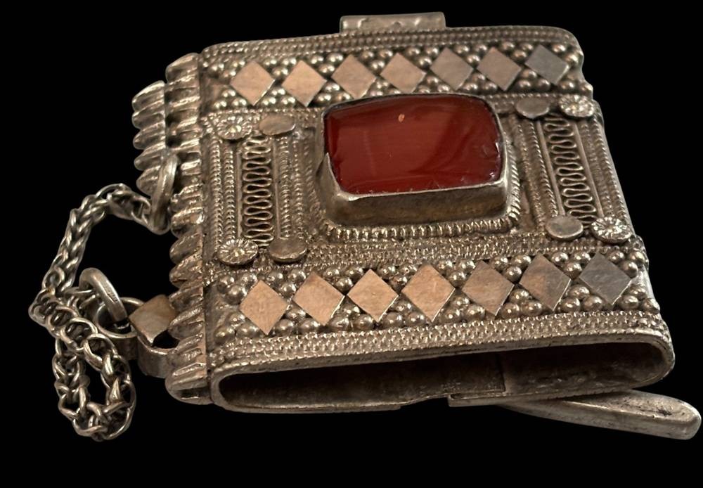 antikes Utensilo?? Koran-Box oder ähnliches, wohl arabisch/Beduinen, Silber geprüft, mittig mit Karneol, 94,3 gr., ca. 7x6 cm, Yemen-Oman? [1]