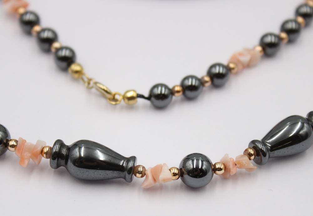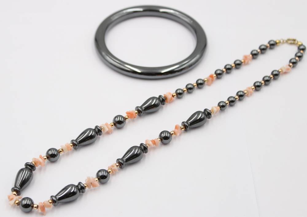 Armreif aus Hämatit sowie Kette mit Hämatit und Koralle .
