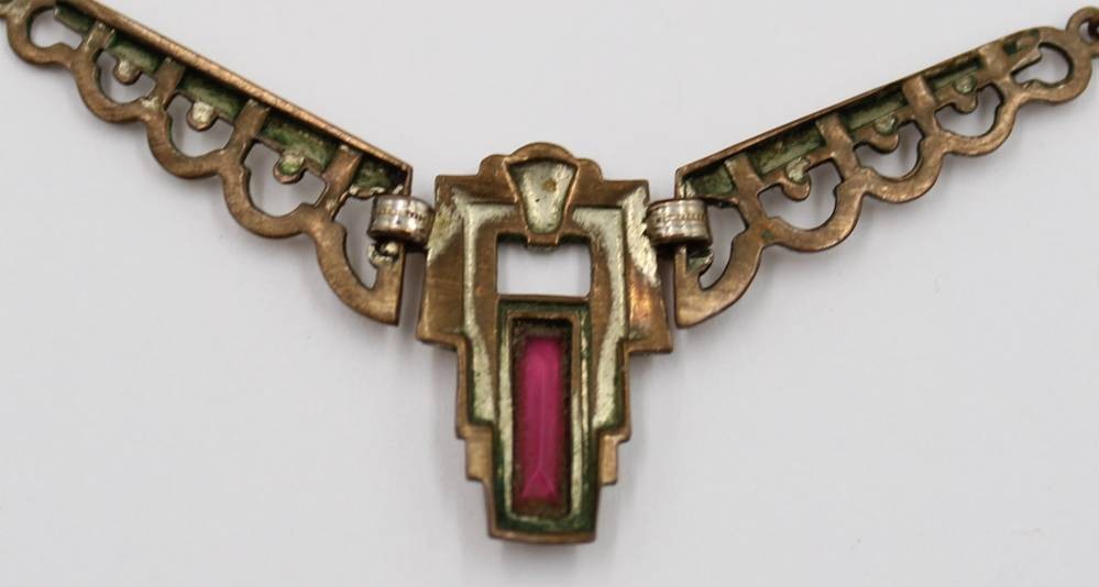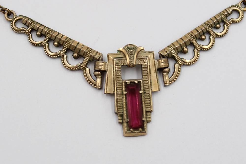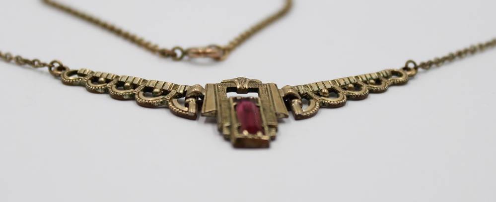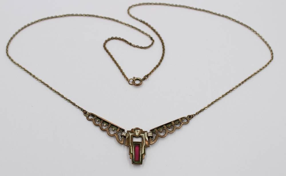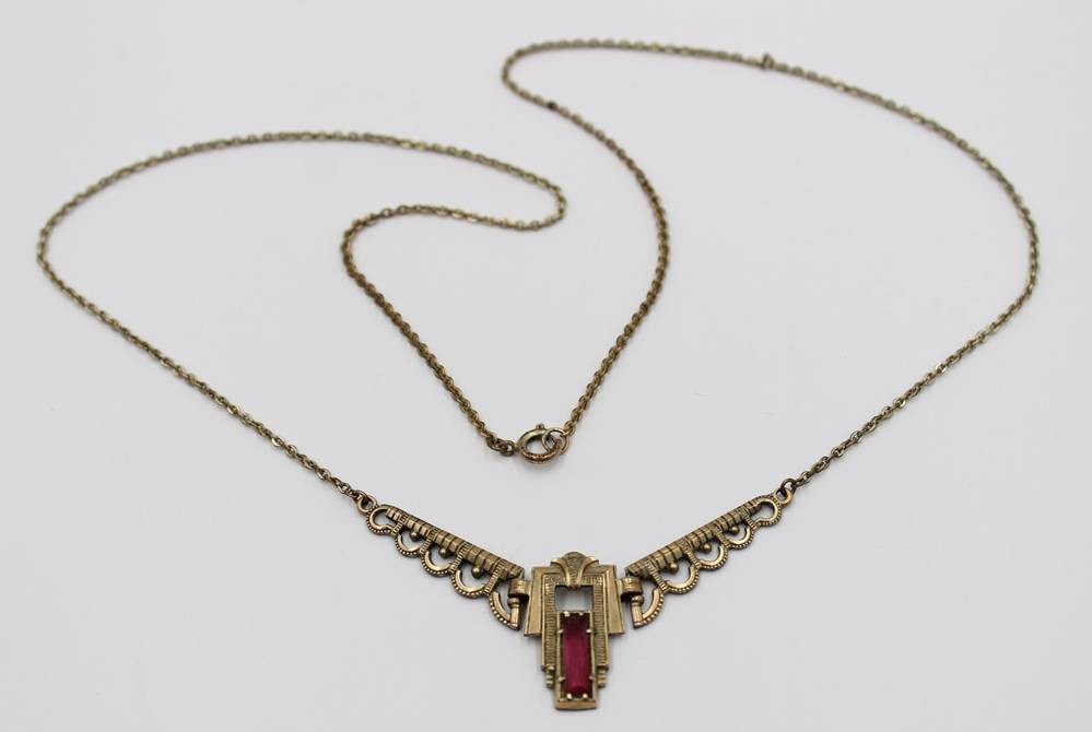 Art-Déco Collier, roter Stein, Messing, Trage-u. Altersspuren, ca. L-48cm [1]