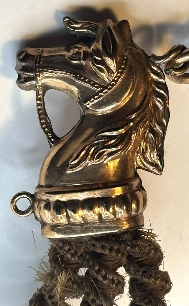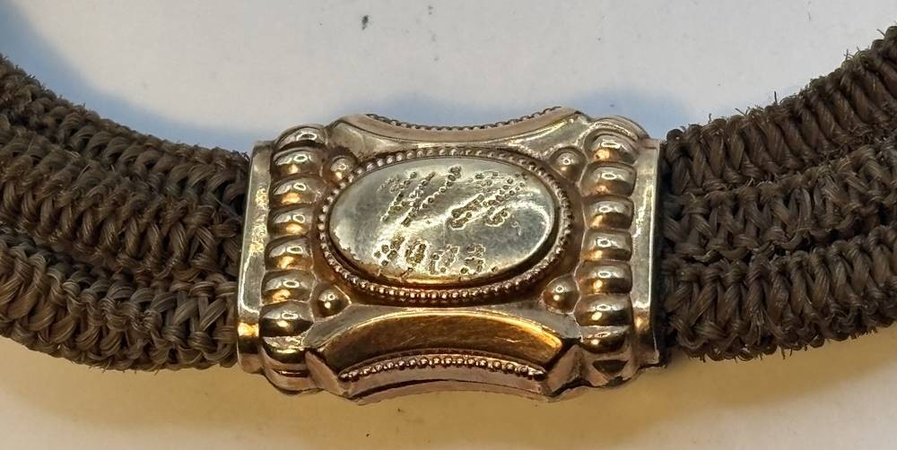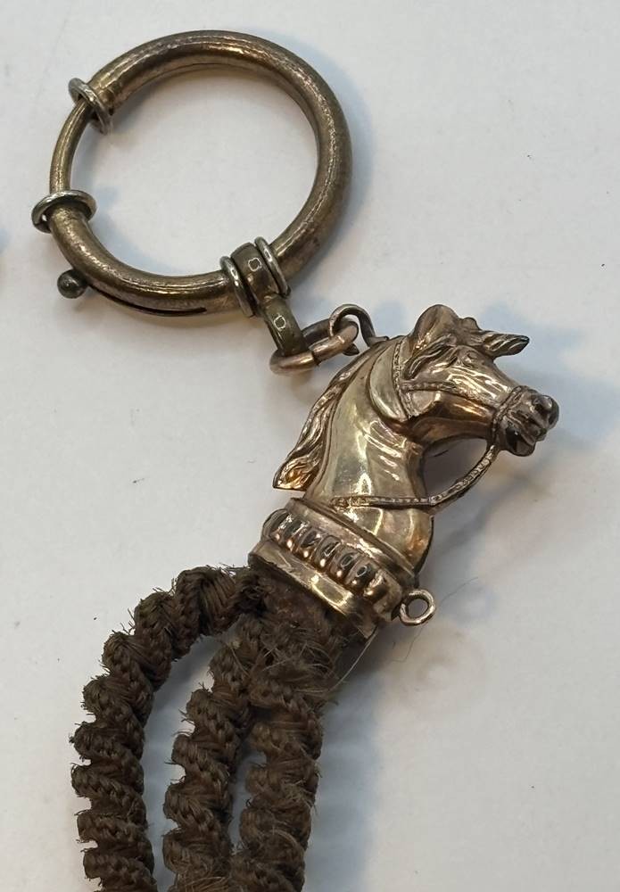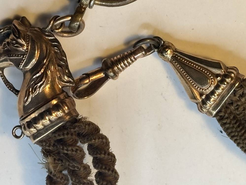 Biedermeier Uhrenkette aus Frauenhaar mit Double (Schaumgold?) Applikationen, Pferdekopf, Mittelstück beidseitig mit verschiedenen Monogramme, 1x dat. 1903, L-ca. 25 cm [1]