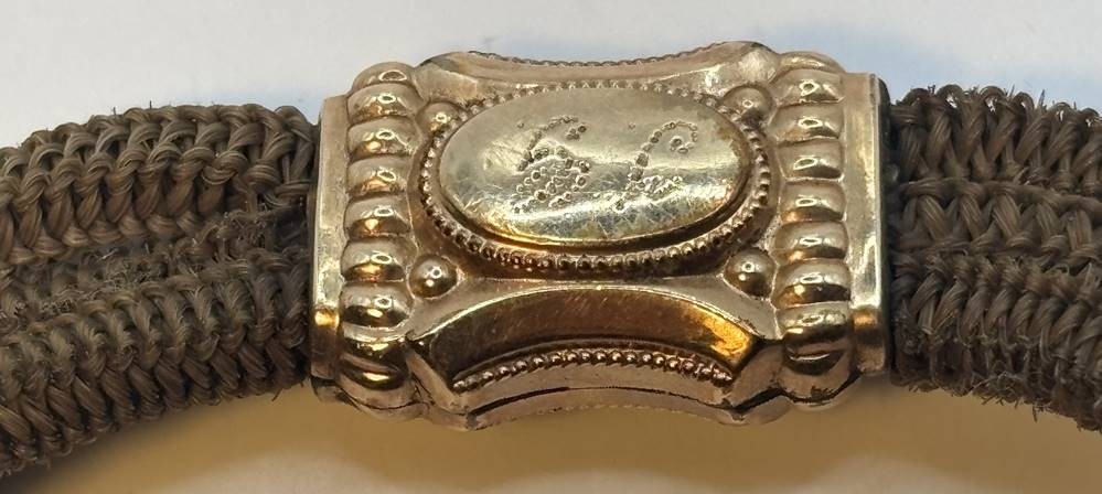 Biedermeier Uhrenkette aus Frauenhaar mit Double (Schaumgold?) Applikationen, Pferdekopf, Mittelstück beidseitig mit verschiedenen Monogramme, 1x dat. 1903, L-ca. 25 cm