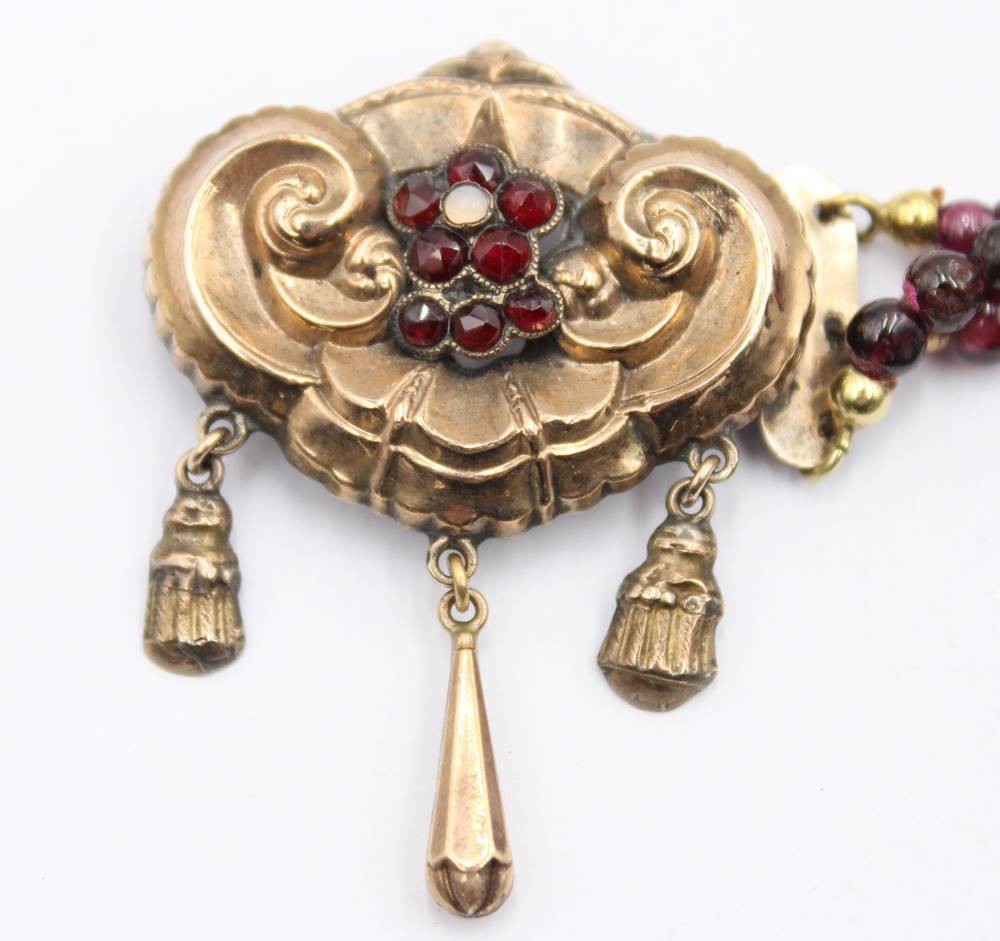 Biermeider-Kropfband, Granat u. Schaumgold, 3reihige, ca. l-34cm