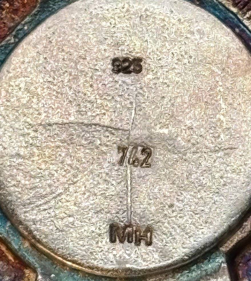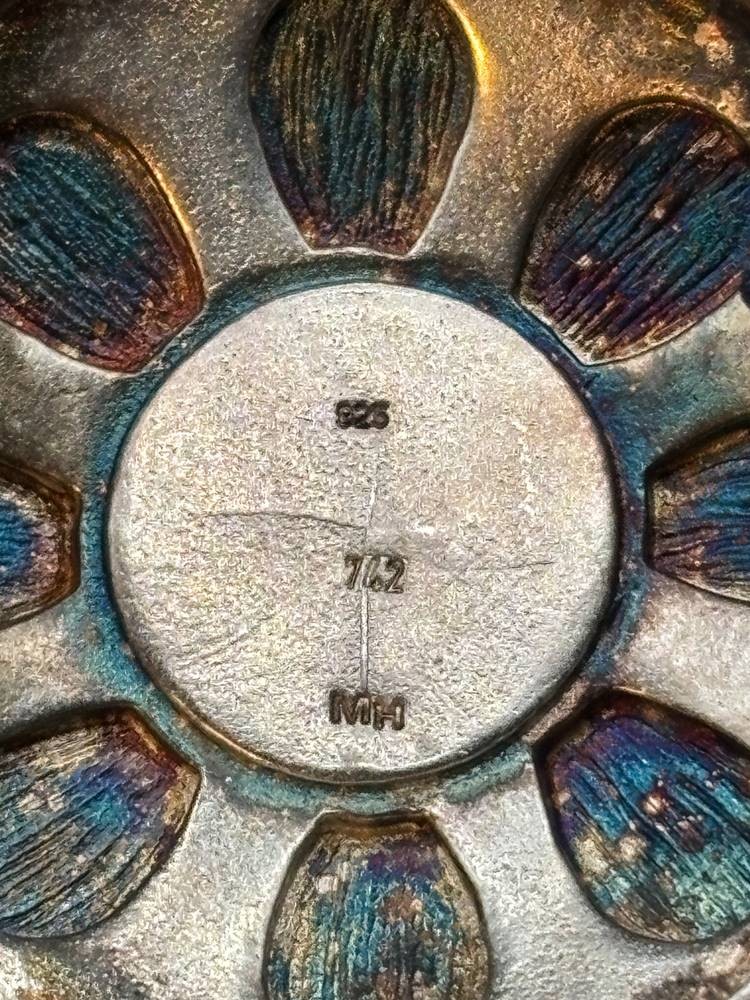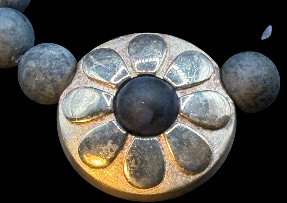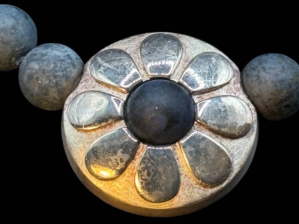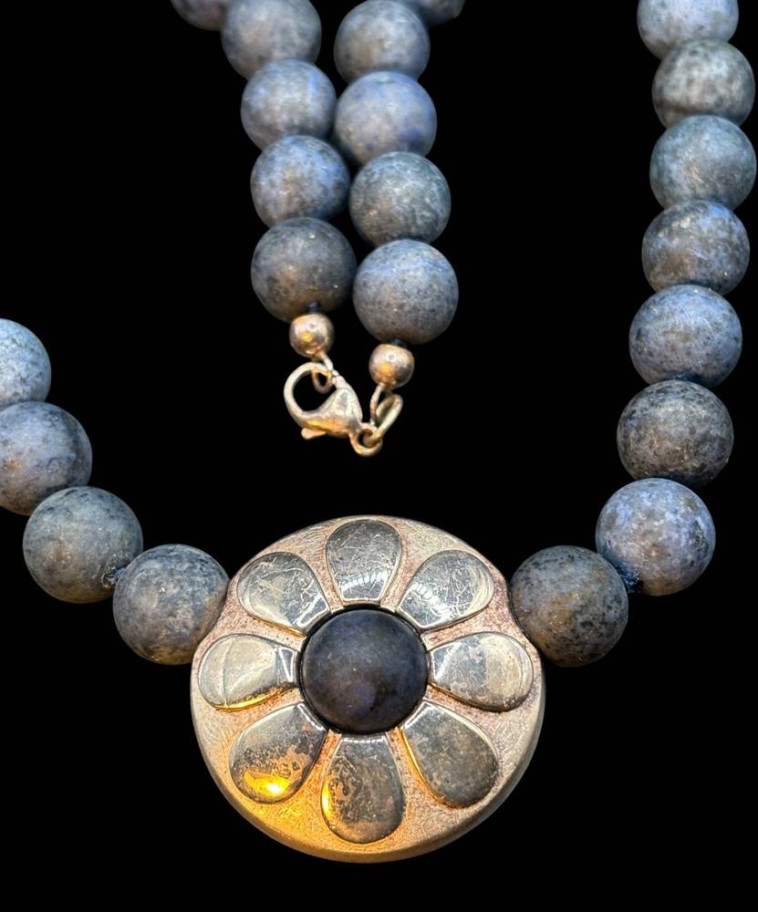 blaues Korallen-Collier mit grossen Silber-925- Mittelstück, Hersteller "MH" ?, L-44 cm, D-3,5 cm, Perlen leicht verlaufend, grösste ca. 11,7 mm, ca. 103 gr [1]