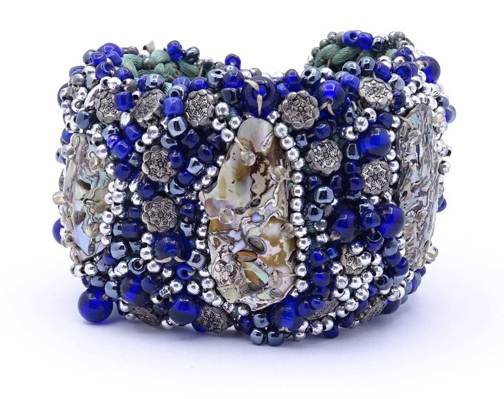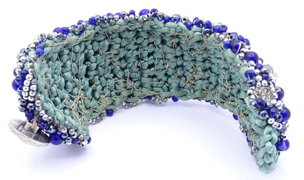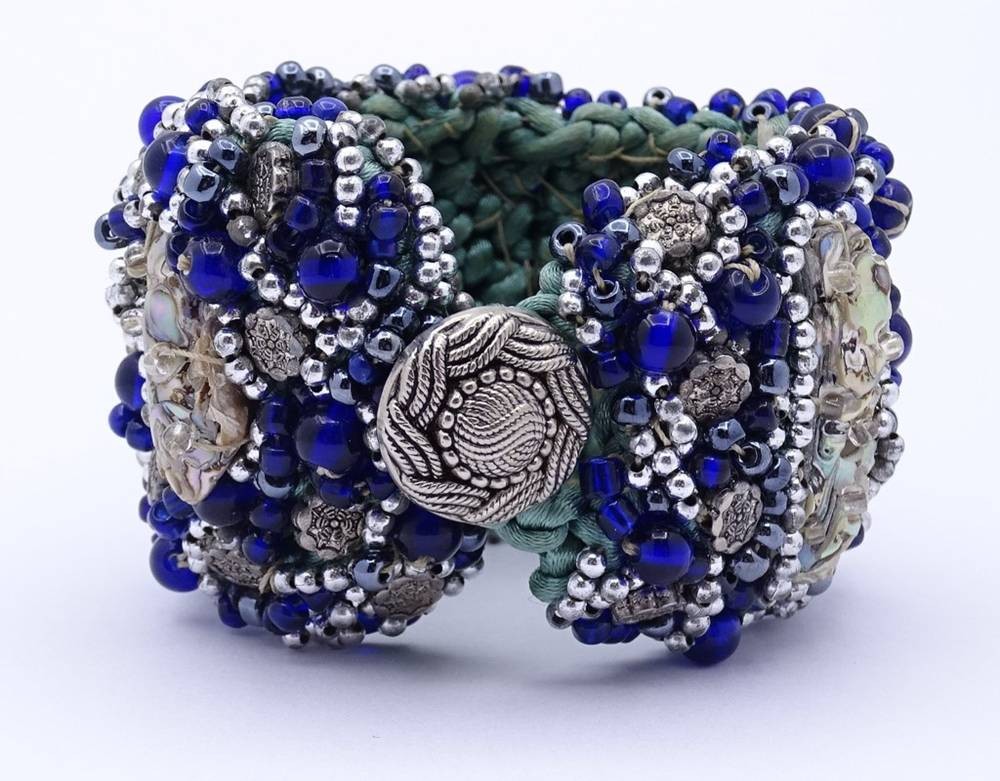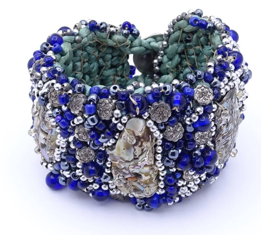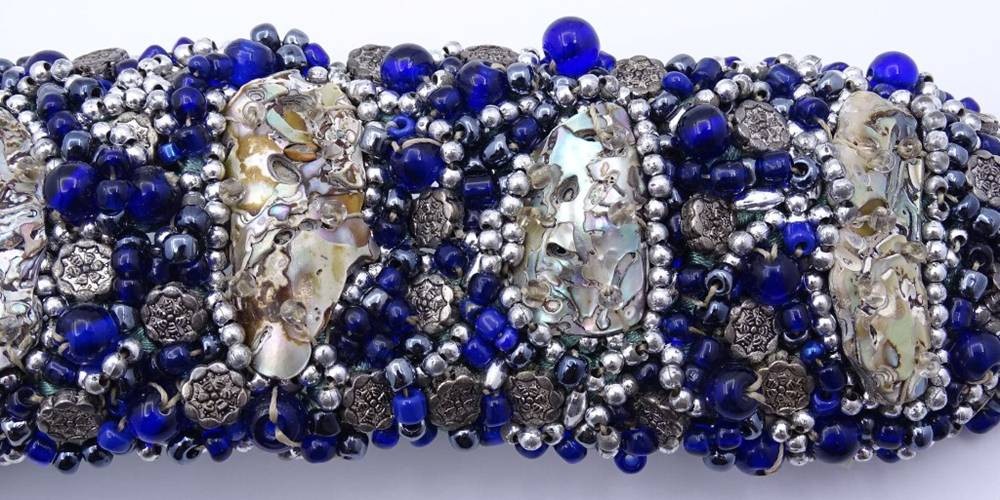 Breites besticktes Armband mit Perlmuttstücken und blau/grauen Farbsteinen,Saatperlchen, Silberknöpfen ? L- 21cm, B- 5,0 cm, Handarbeit, wohl 50/60-er Jahre [1]