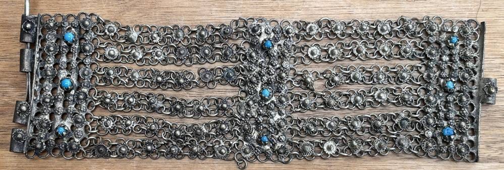 breites Ethno-Armband, Anatolien??, wohl versilbert mit 9 blauen Steinen, L-21 cm, B-6 cm, 213 gr., Handarbeit [1]
