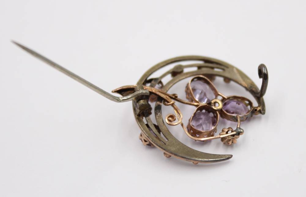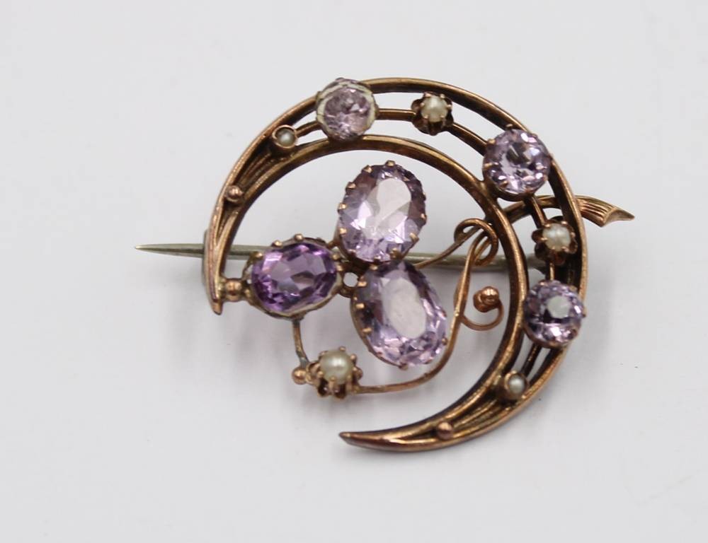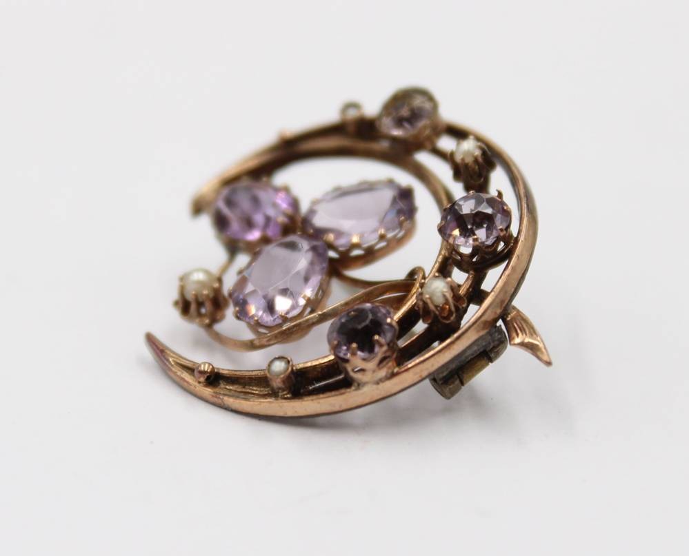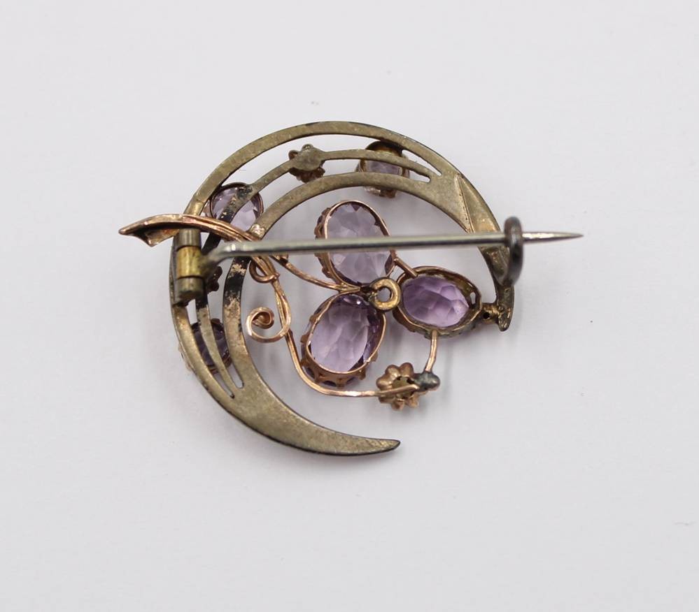 Brosche, 19. Jhd. wohl Gold um 14ct, Amethyste und Saatperlchen, 2,8gr., D-2,5cm [1]