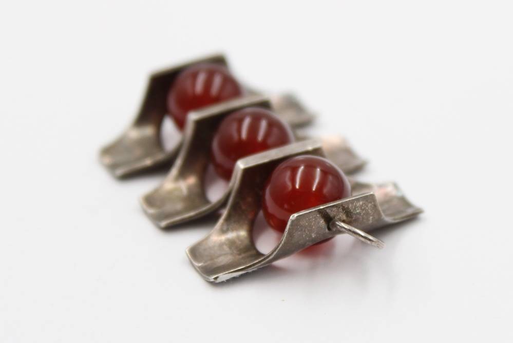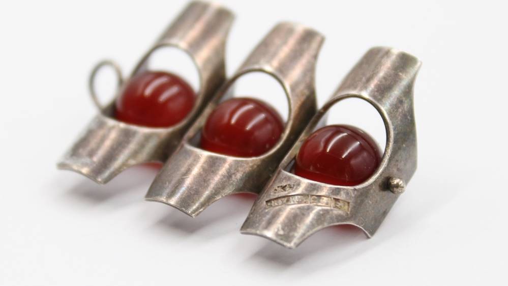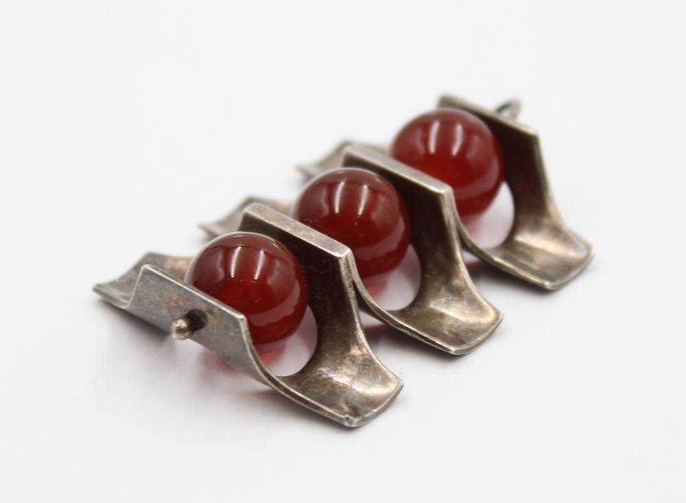 Design-Brosche, Finland, Kultaseppä Salovaara , Karneolkugeln, zus. ca. 11,4gr., L-4,2cm [1]