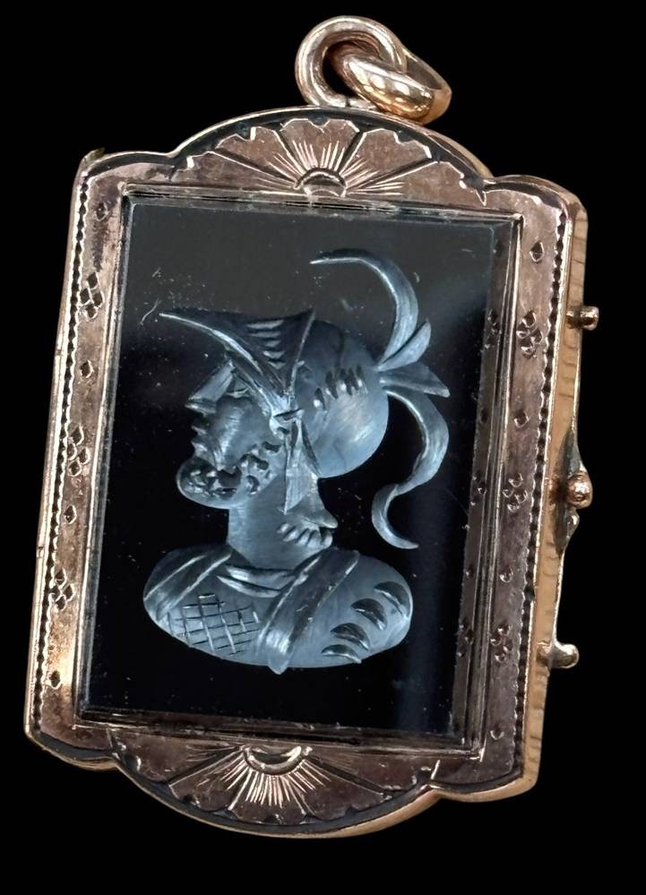 Double Medaillon, schwarze Onyx-Platte mit Krieger-Kopf, ca. 3x2 cm, 11,2 gr. [1]