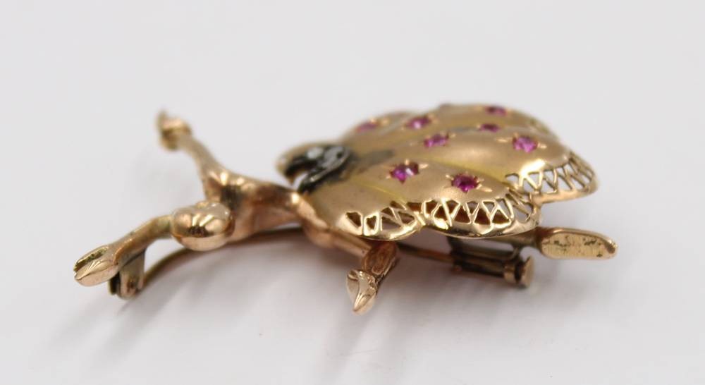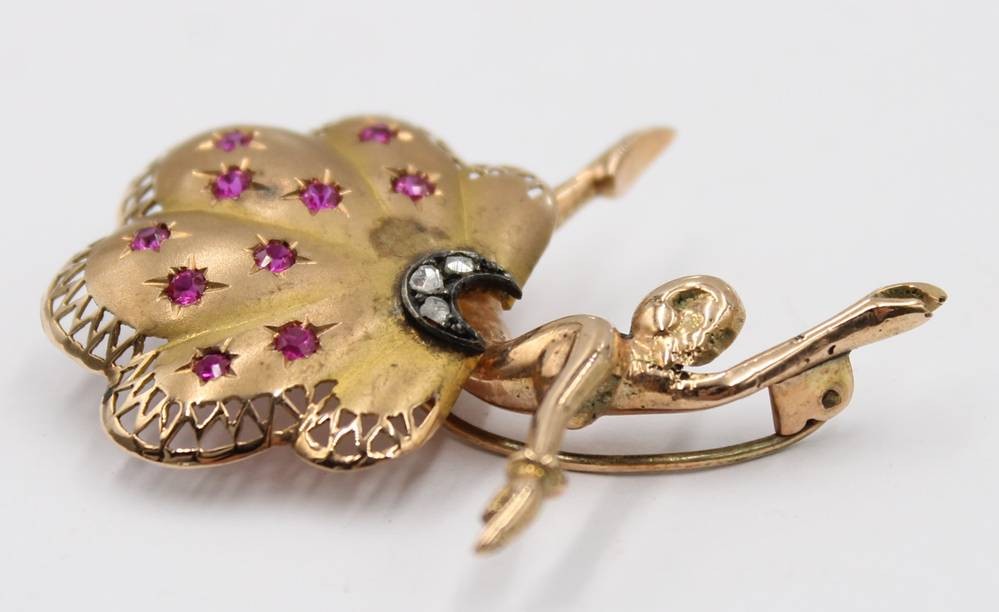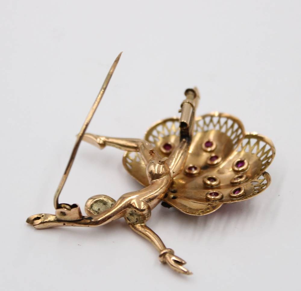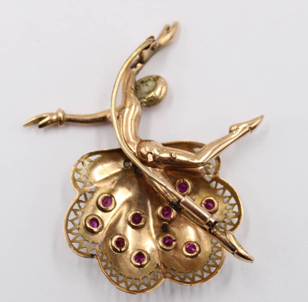 figürliche Brosche um 1920, Ballerina, Gold um 14 ct (gepr.), Diamanten und Rubine, 11,2gr., ca. L-4,5cm [1]