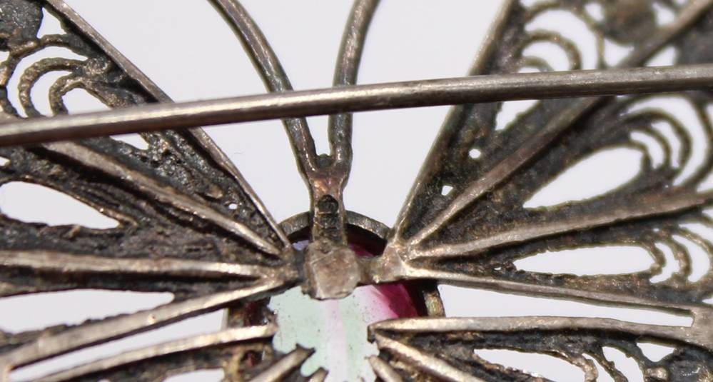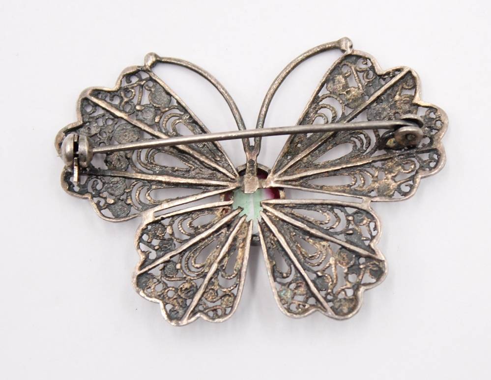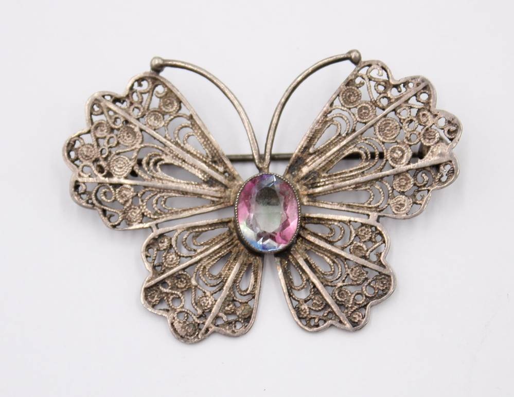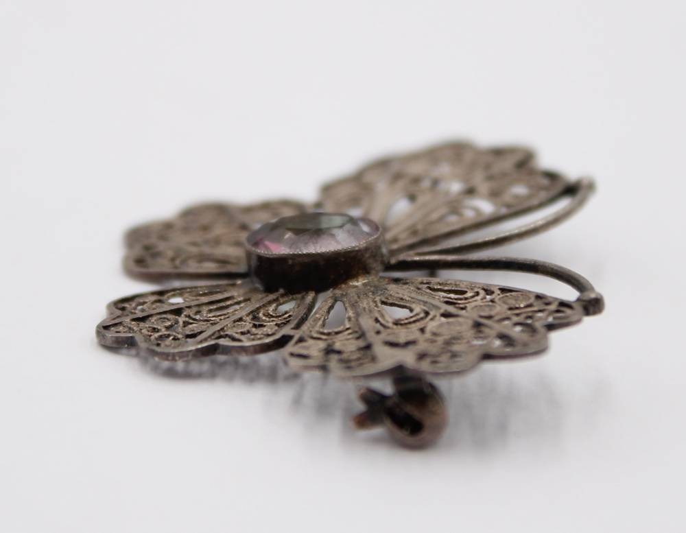 filigrane Schmetterlingsbrosche, 835er Silber, Rheinkiesel, 5,4gr., ca. 3,3 x 4,8cm [1]