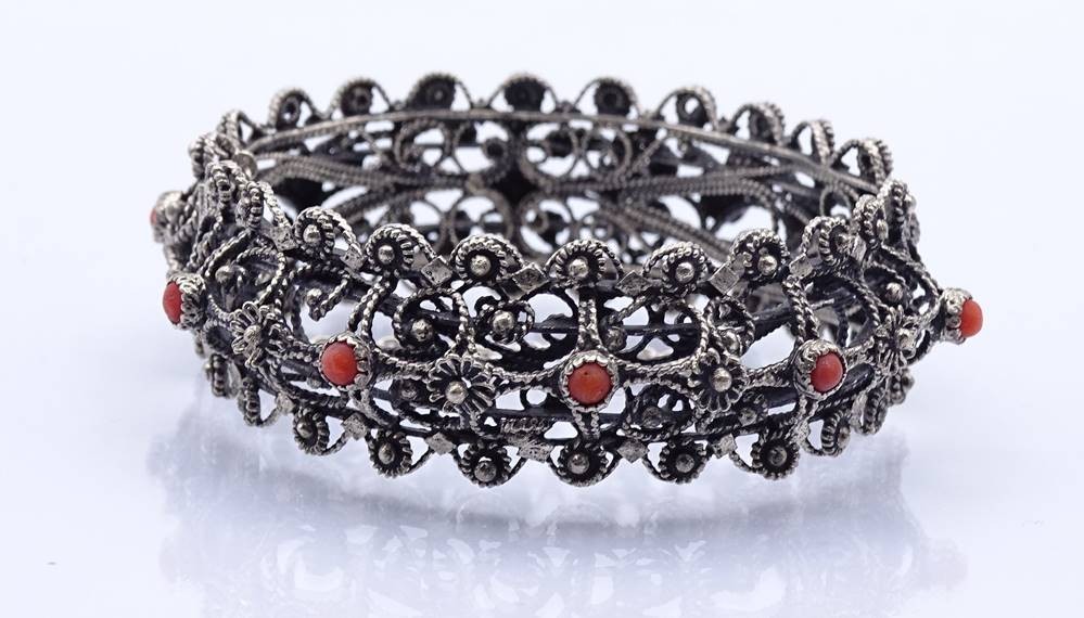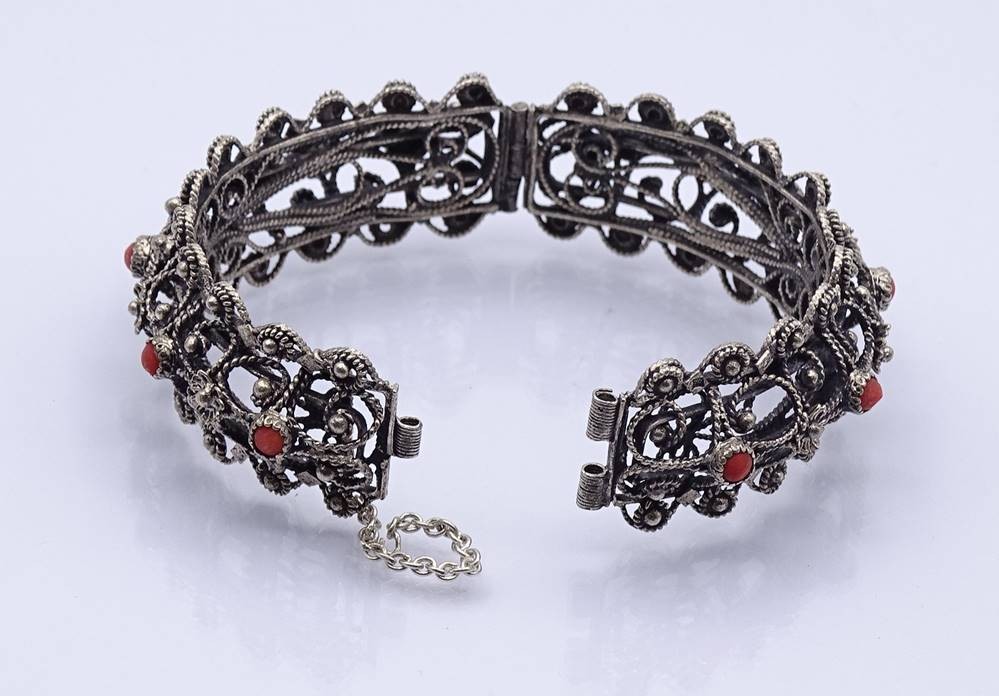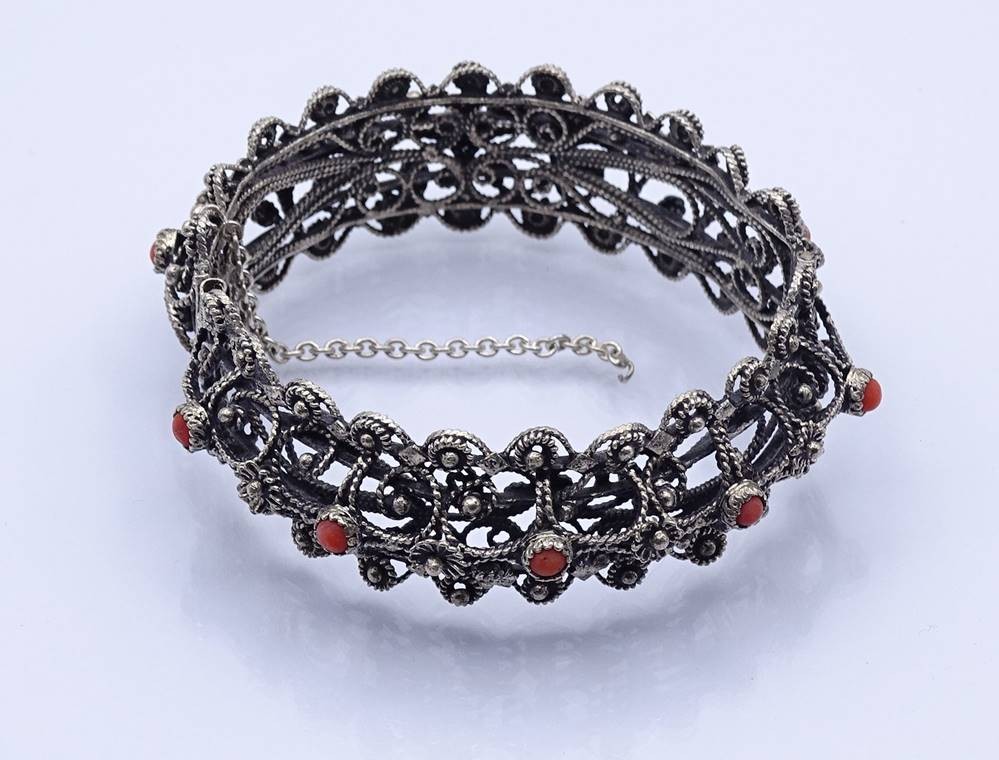 Filigranes Silber Armband mit Koralle, Silber gepr, Stift fehlt, B. 2,2cm, 39,5g. [1]
