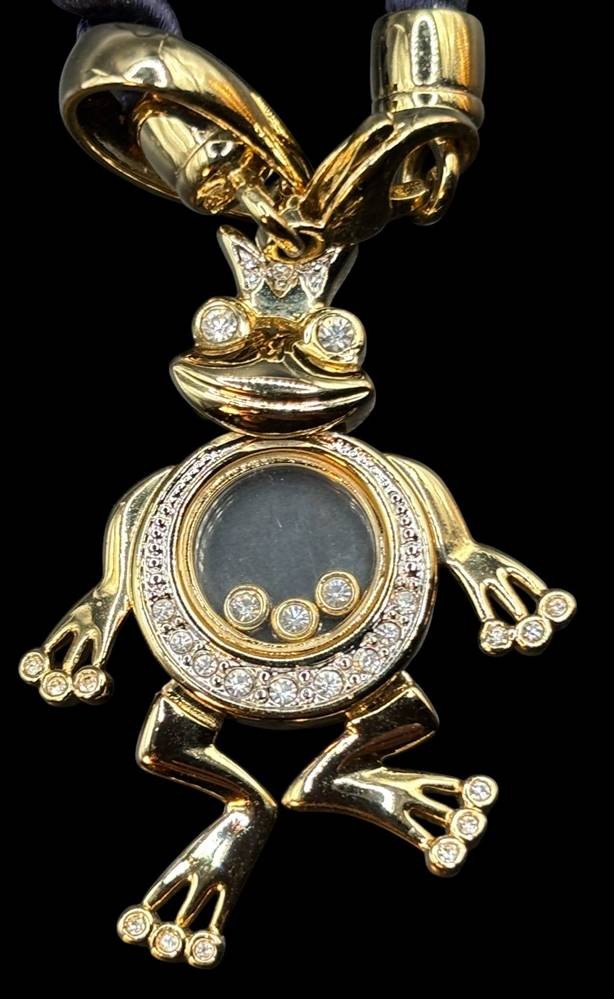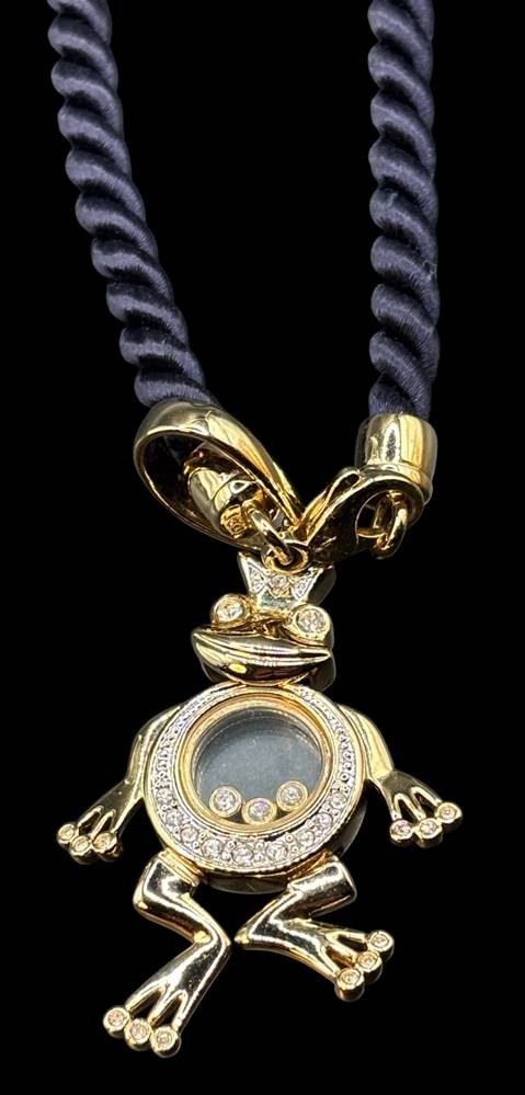 gedrehte Stoff-Halskette mit grossen, beweglichen Froschanhänger "Pierre Lang" goldfarben mit klaren Steinen, Kette ca. 42 cm, Anhänger 6cm [1]