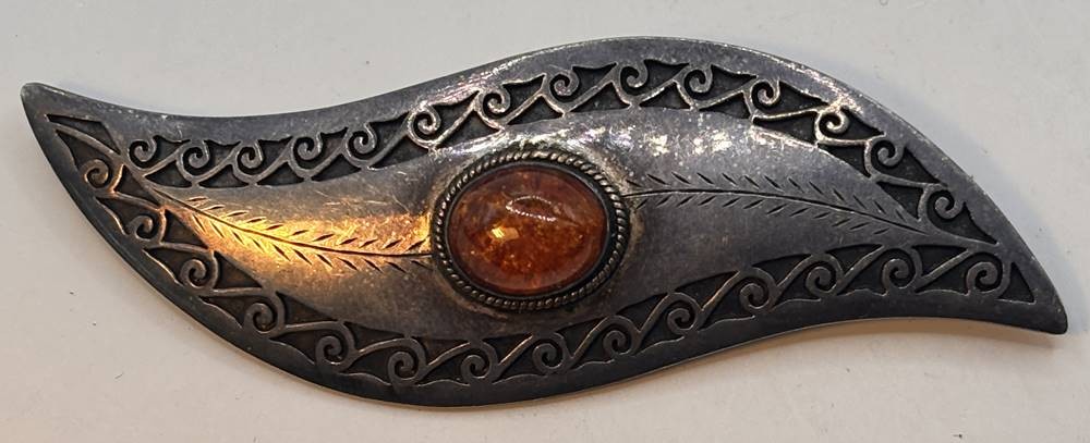 geschweifte Silberbrosche-925- mit Bernstein, L-8 cm, 25,4 gr. [1]