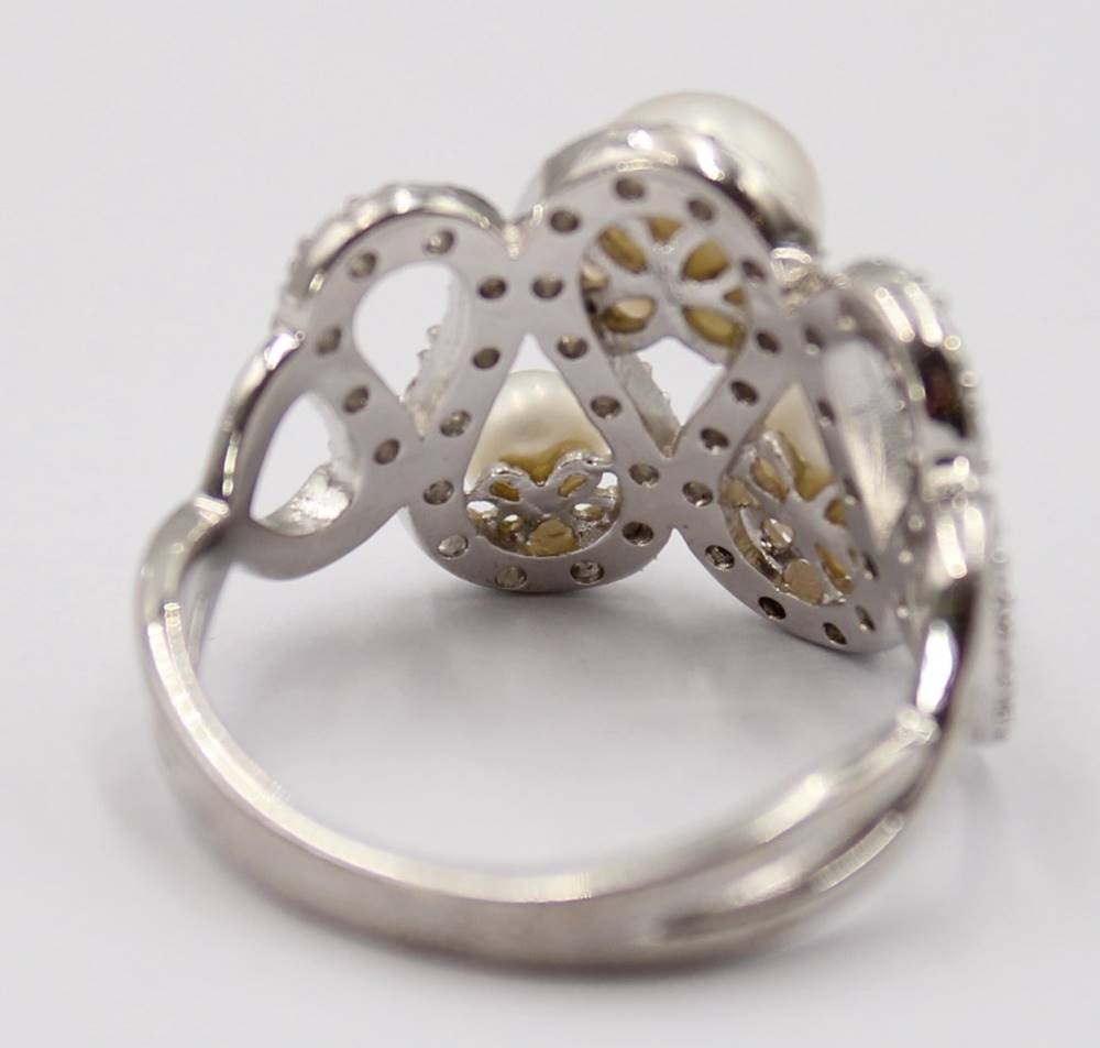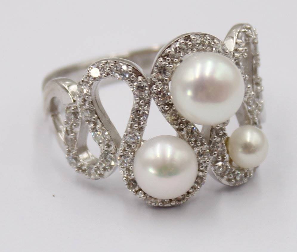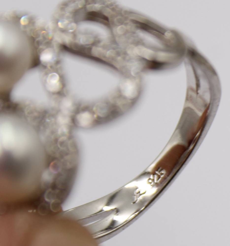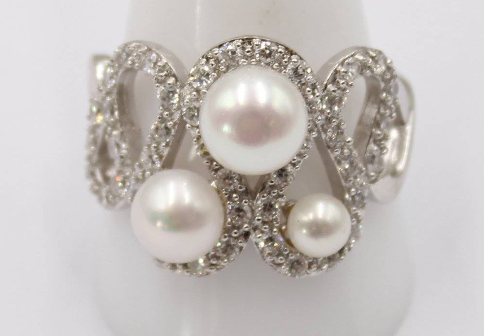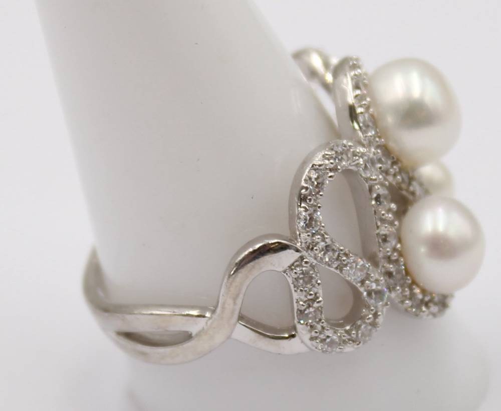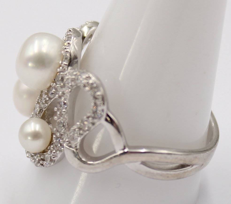 Glamouröser Silberring mit Perlen und weißen Steinen, 925er Silber, guter Zustand, RG 65, 7,3 Gramm [1]