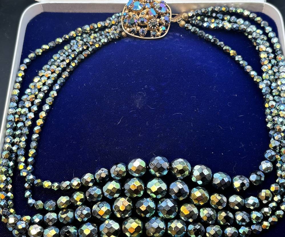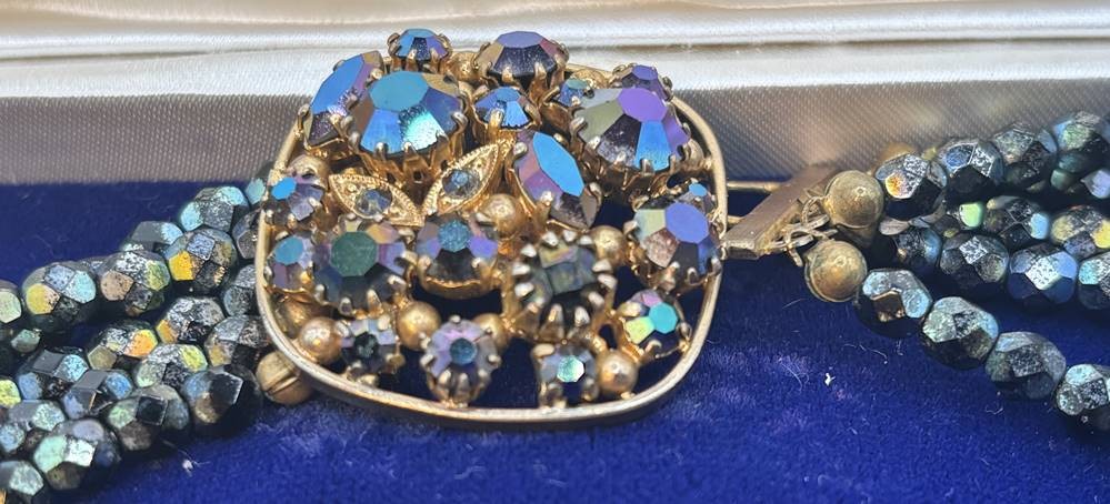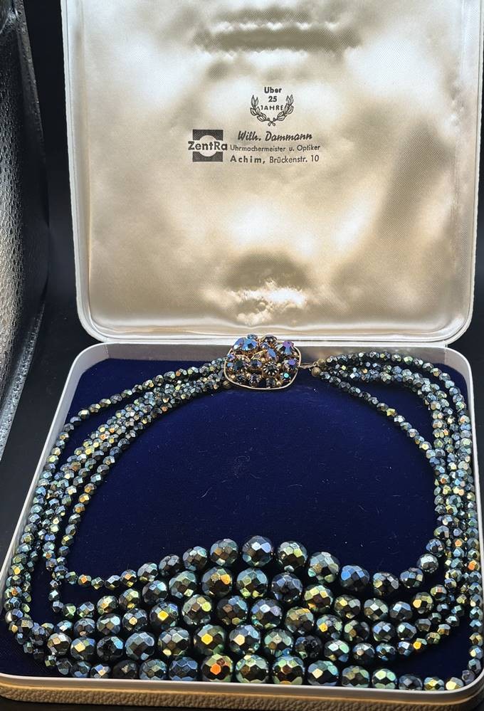 Glasperlen Collier, irisierend, wohl Böhmen, 5-reihig mit grosser Schliesse, wohl Gablonz? in Kasten, 50/60-er Jahre [1]