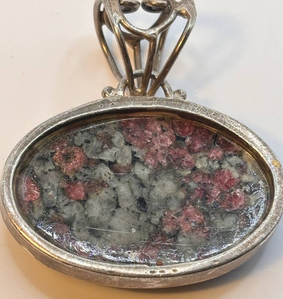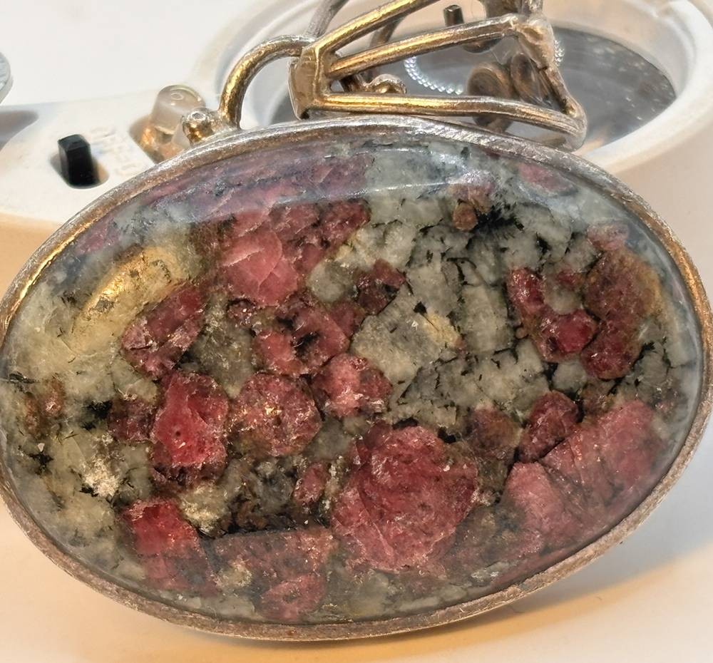 gr. Brosche mit Eudialyt Cabouchon, Russland, wohl Halbinsel Kola in Silberfassung, H- mit Öse 4,5 cm, B-4 cm, 17,1 gr. [1]