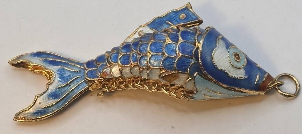 gr. emaillierter Fisch als Kettenanhänger, beweglich, L-8 cm, tw goldfarben