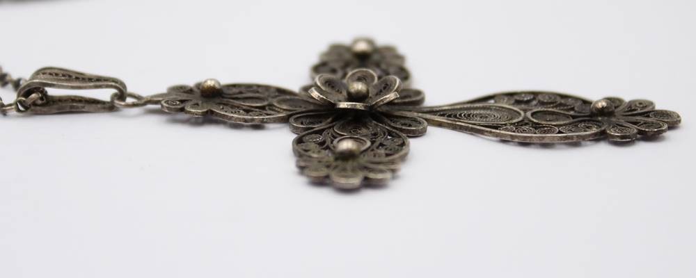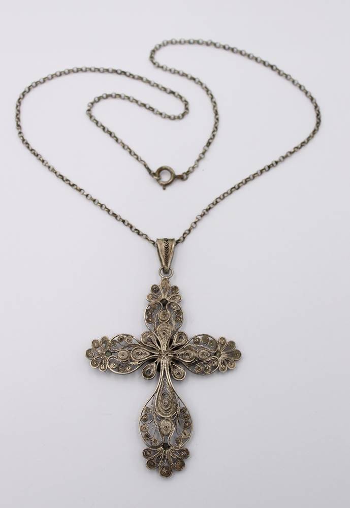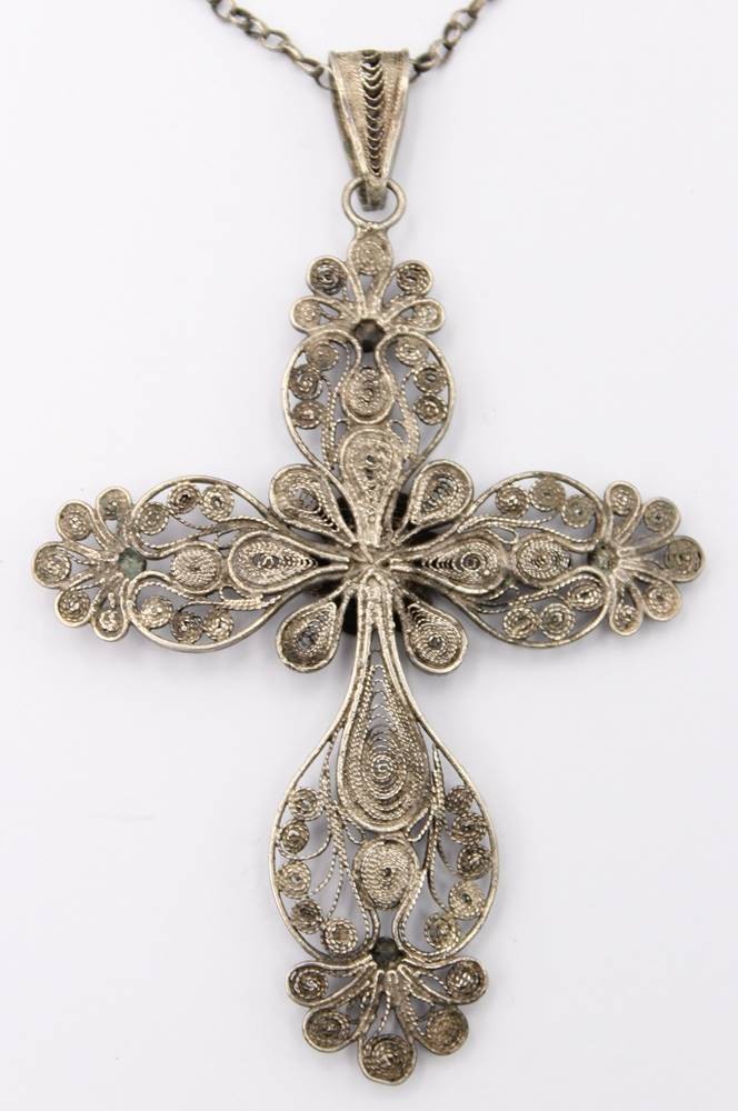 gr. filigran gearbeitetes Brustkreuz an Kette, Silber (gepr.), wohl um 1900, 13,7gr, Kette ca. L-48cm Kreuz L-8cm [1]