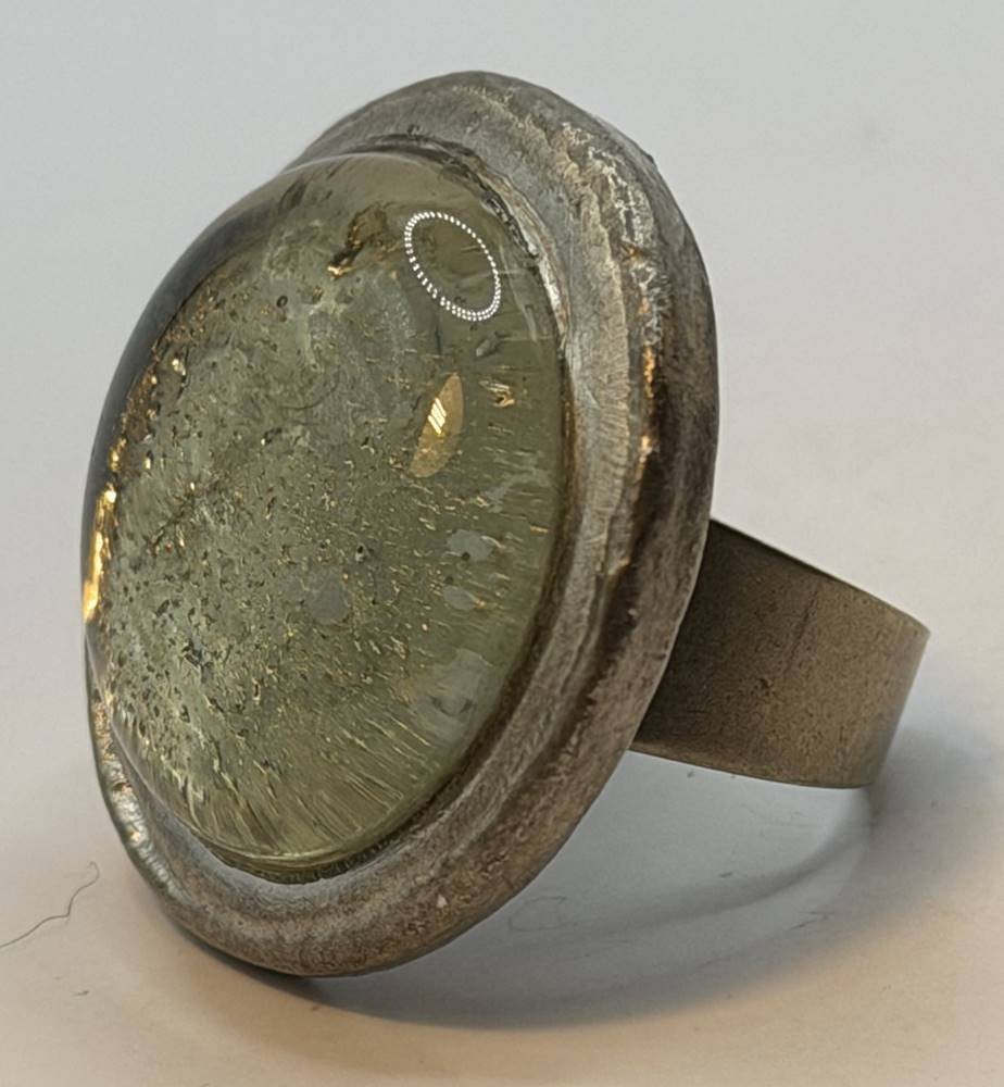 gr. runder Zinnring, nur "Denmark" gestempelt,klarer Stein, D-2,2 cm, 21,6 gr., Handarbeit, D-3 cm, 24,8 gr., Handarbeit