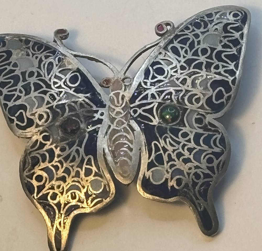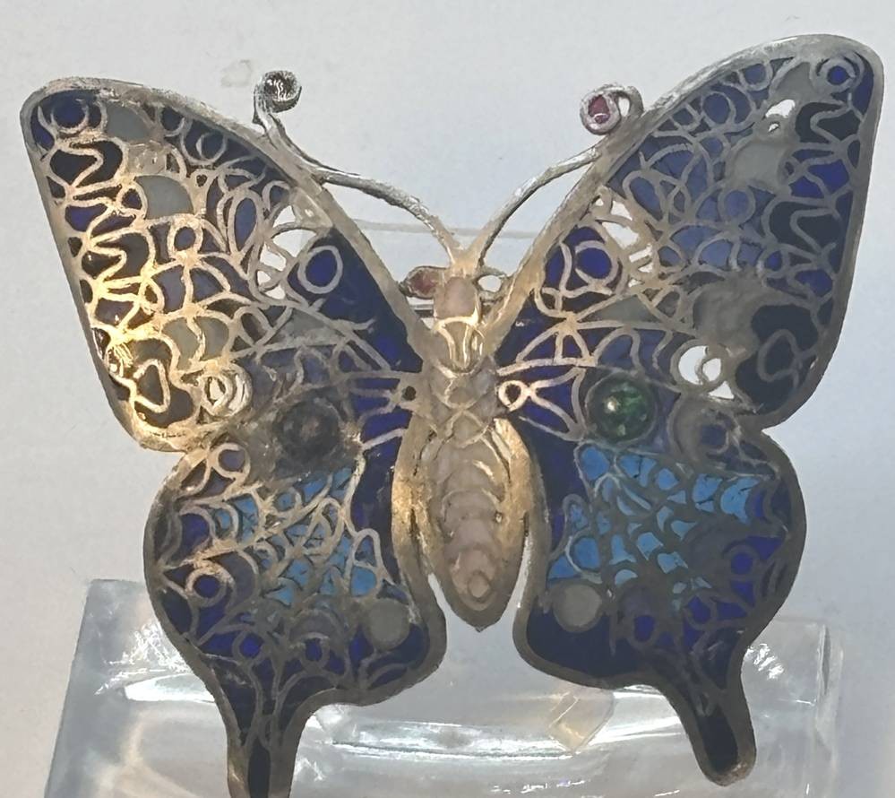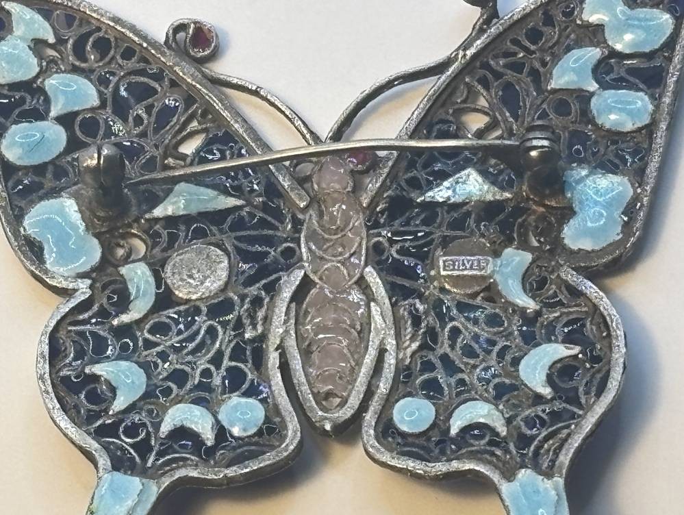 gr. Silber Schmetterlings-Brosche , Plique a Jour Glas mit Farbsteinen [1]