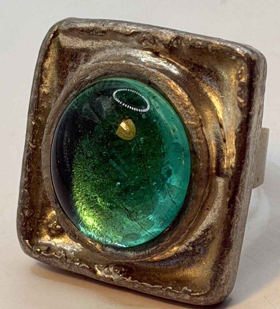 gr. Zinnring, nur "Denmark" gestempelt, grüner Stein, Handarbeit, offene Ringschiene, Ringkopf ca. 2,5x2,5 cm, 25,7 gr.