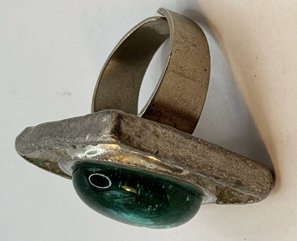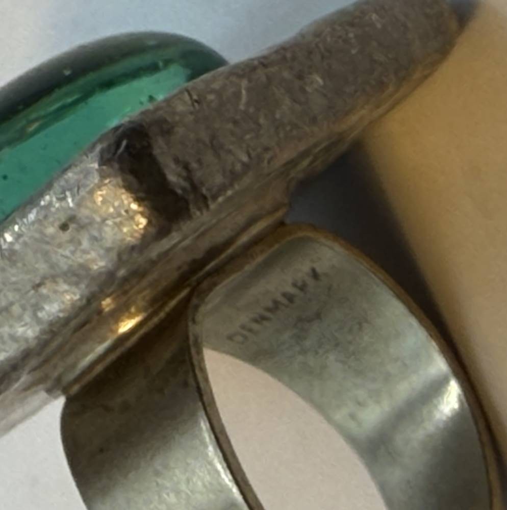 gr. Zinnring, nur "Denmark" gestempelt, grüner Stein, Handarbeit, offene Ringschiene, Ringkopf ca. 2,5x2,5 cm, 25,7 gr. [1]