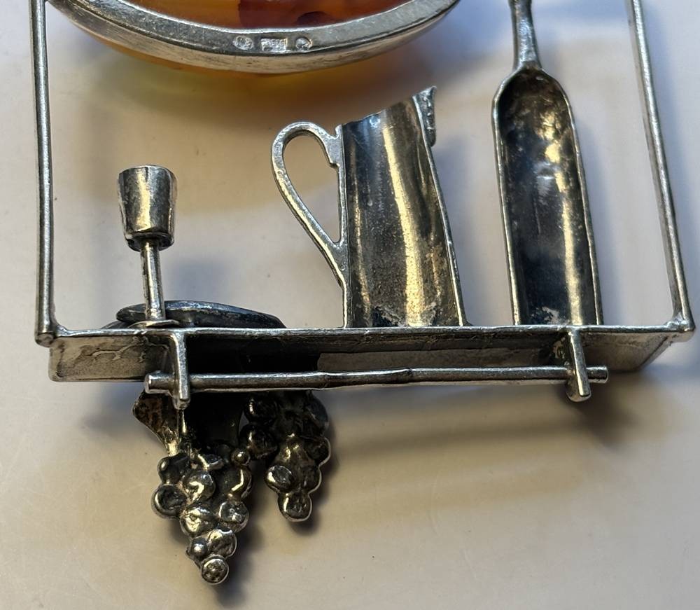 grosse Brosche, Silber-925- mit Bernstein, Regal mit Weinflasche, Wasserkrug, Becher und Früchte wie Trauben, Bananen, 5,5x5 cm, 26,4 gr. [1]