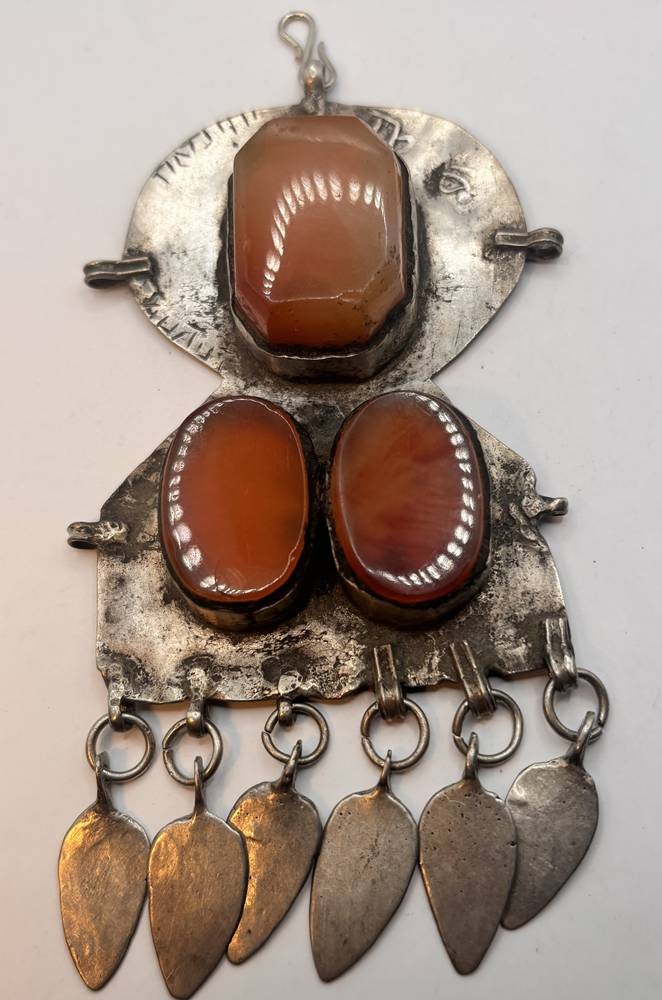 grosser Silber-Anhänger mit 3 grossen braunen Steinen, wohl Persien, 2 undeutliche Punzen und Randbeschriftung?, L-ca. 12 cm, 97 gr. [1]