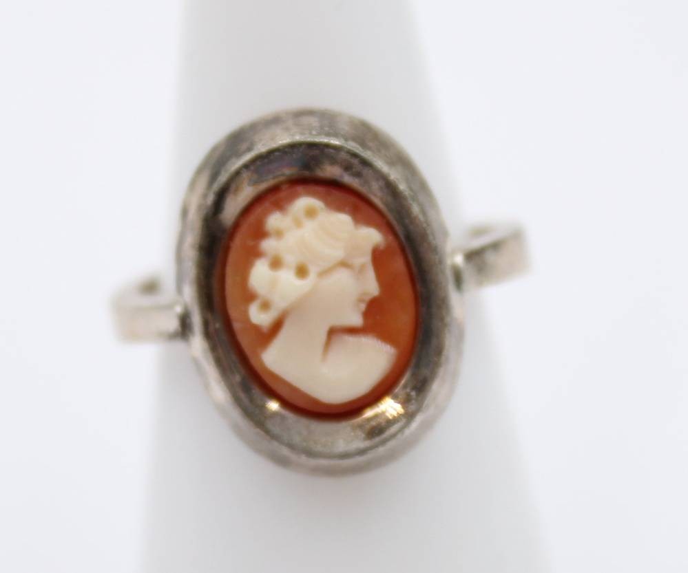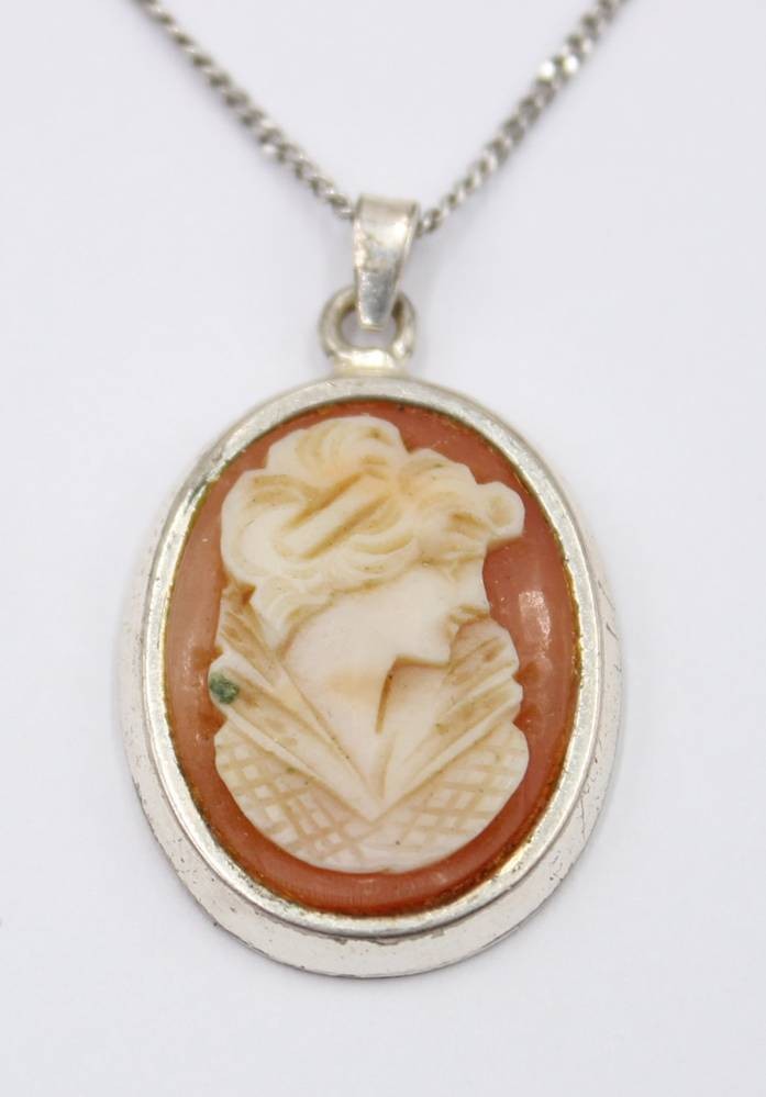 Halskette mit Camé-Anhänger sowie passender Ring, je 835er Silber, Ring mit offener Schiene, zus. ca. 13,6gr., Kette L-42cm Anh. L-2,8cm [1]